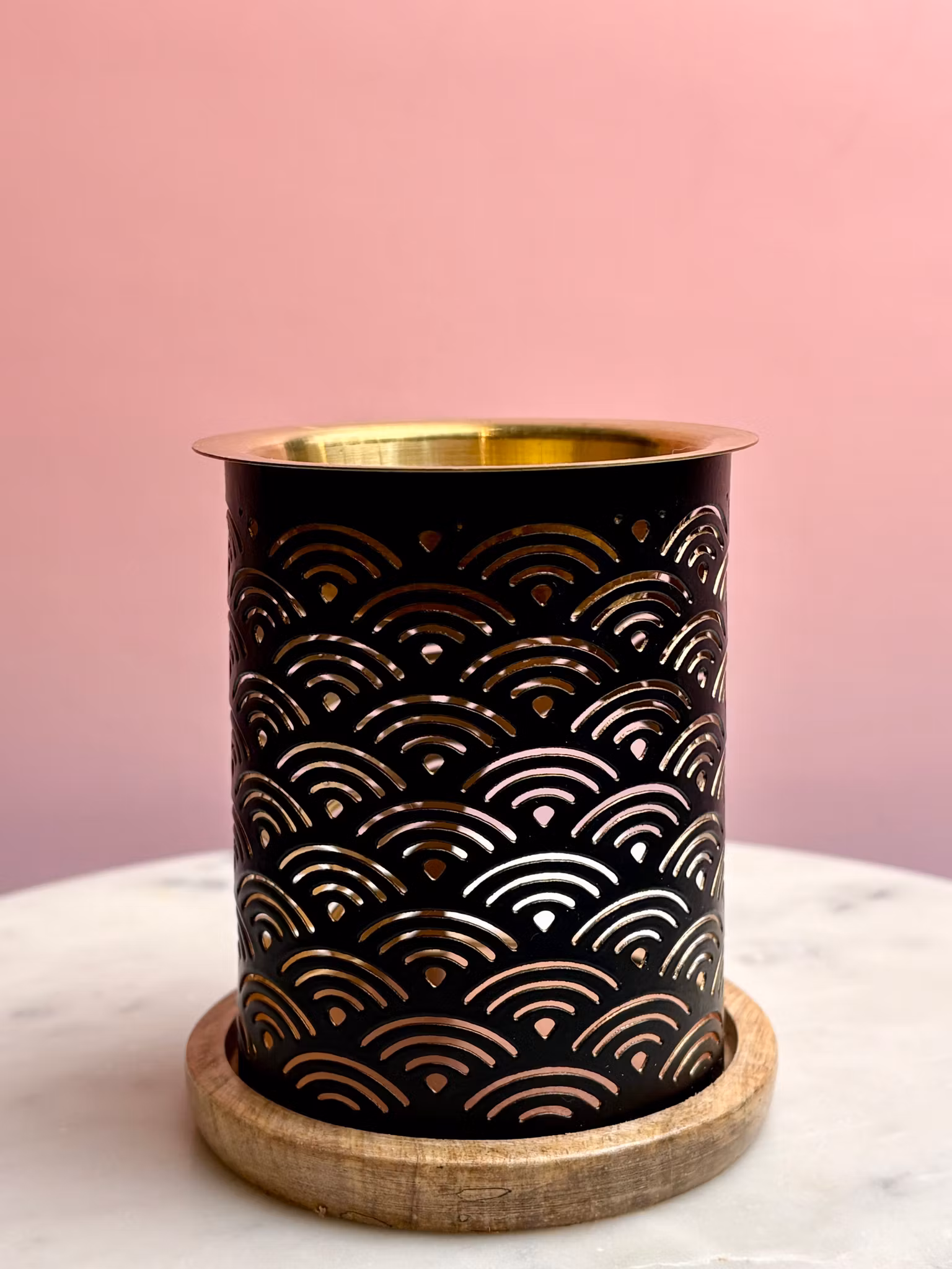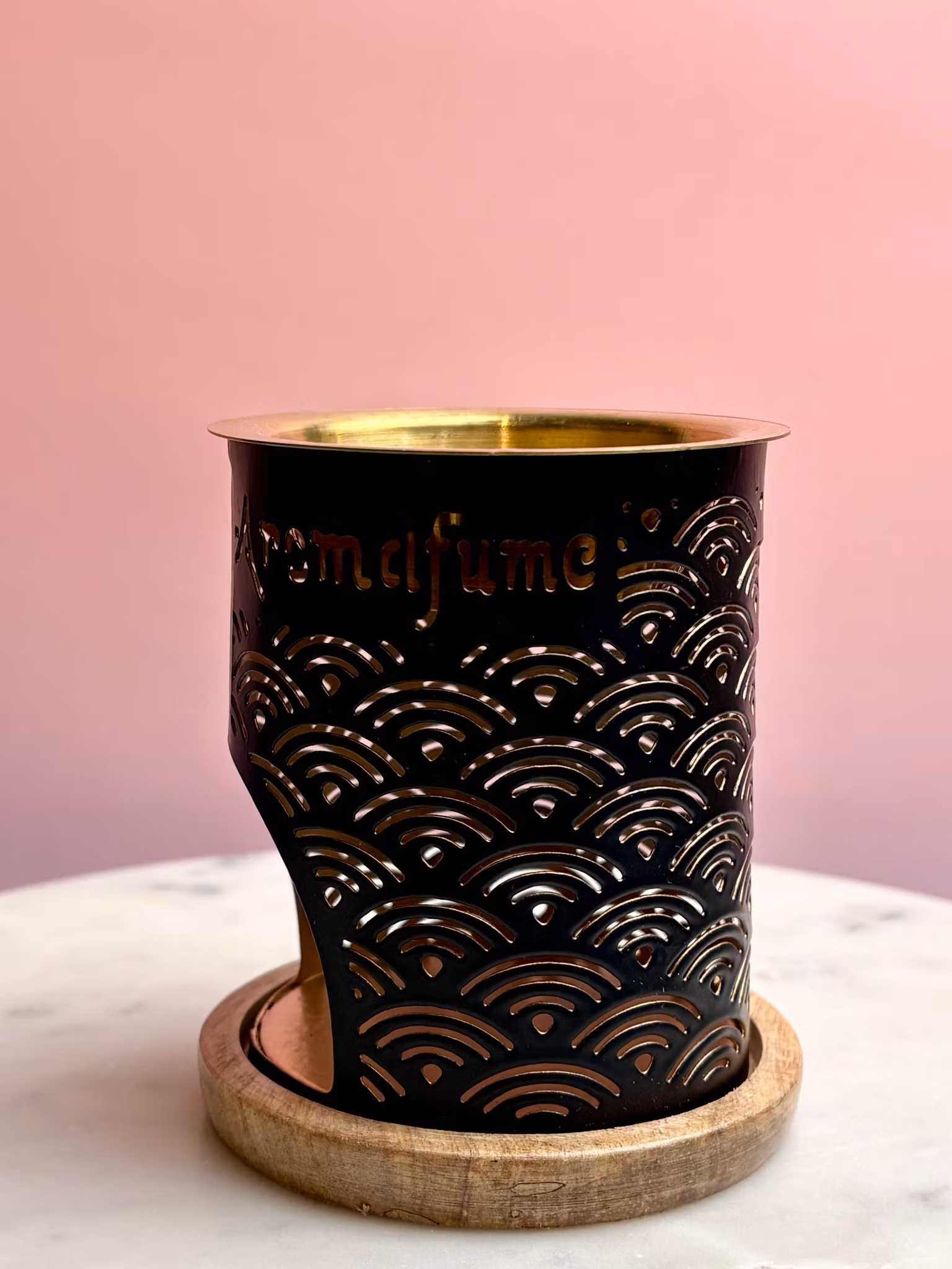 Oljebrännare i metall med kopparbehållare och träunderlägg