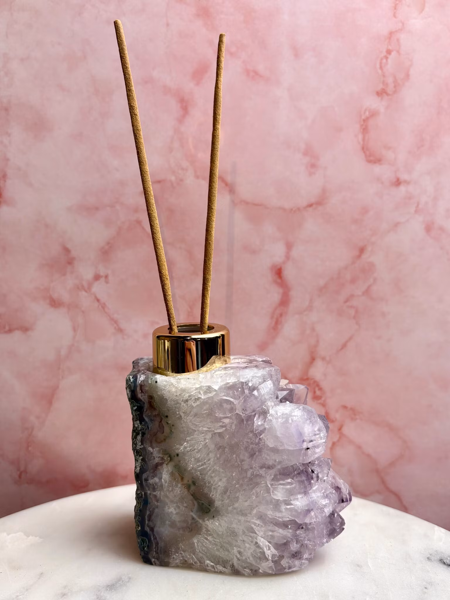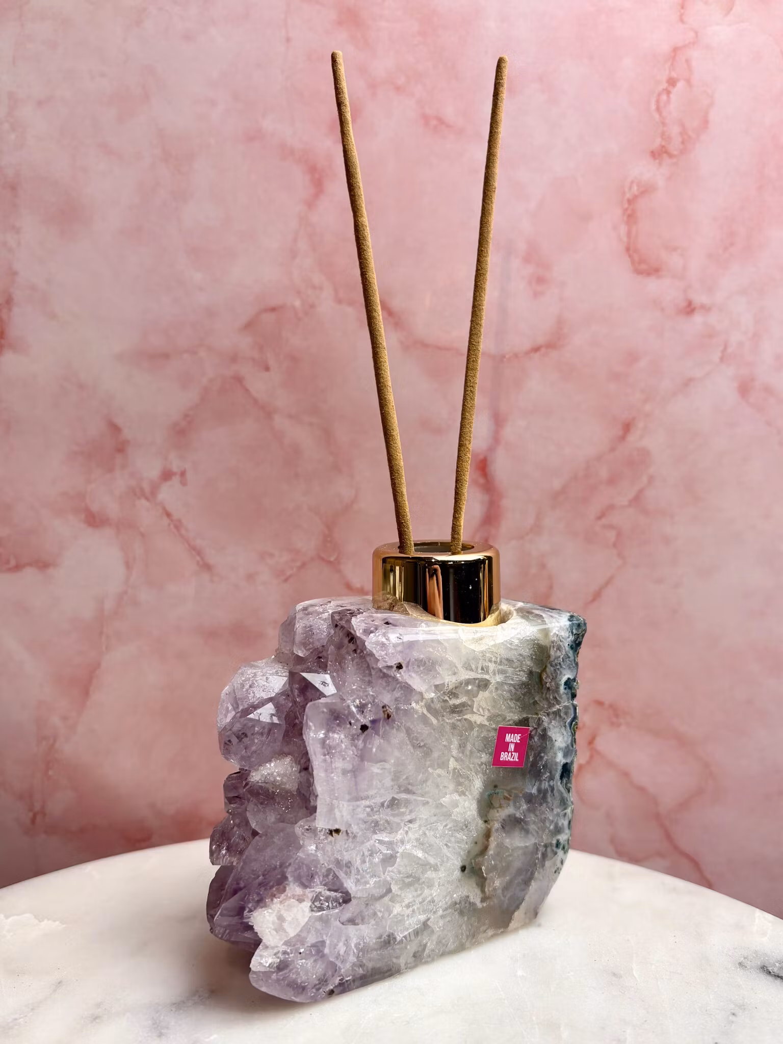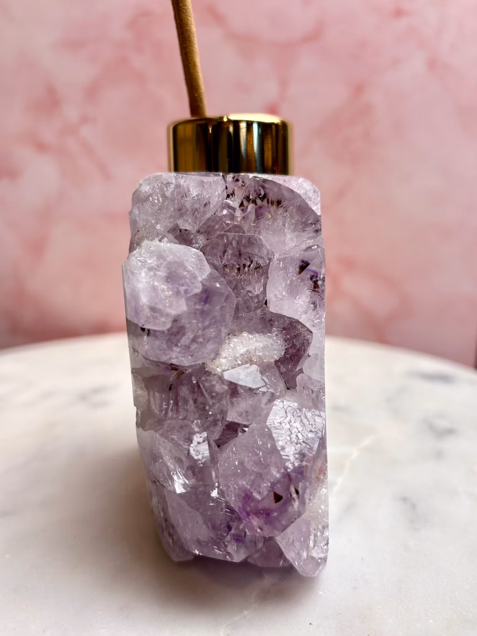 Denna eleganta diffuser i ametist kombinerar kristallens lugnande och spirituella energi med aromaterapins välgörande egenskaper. Perfekt för att användas med eteriska oljor och doftpinnar, den sprider en harmonisk doft samtidigt som den fyller rummet med ametistens skyddande och avslappnande vibrationer. En vacker inredningsdetalj som skapar en fridfull atmosfär, idealisk för meditation, avslappning och energibalansering.