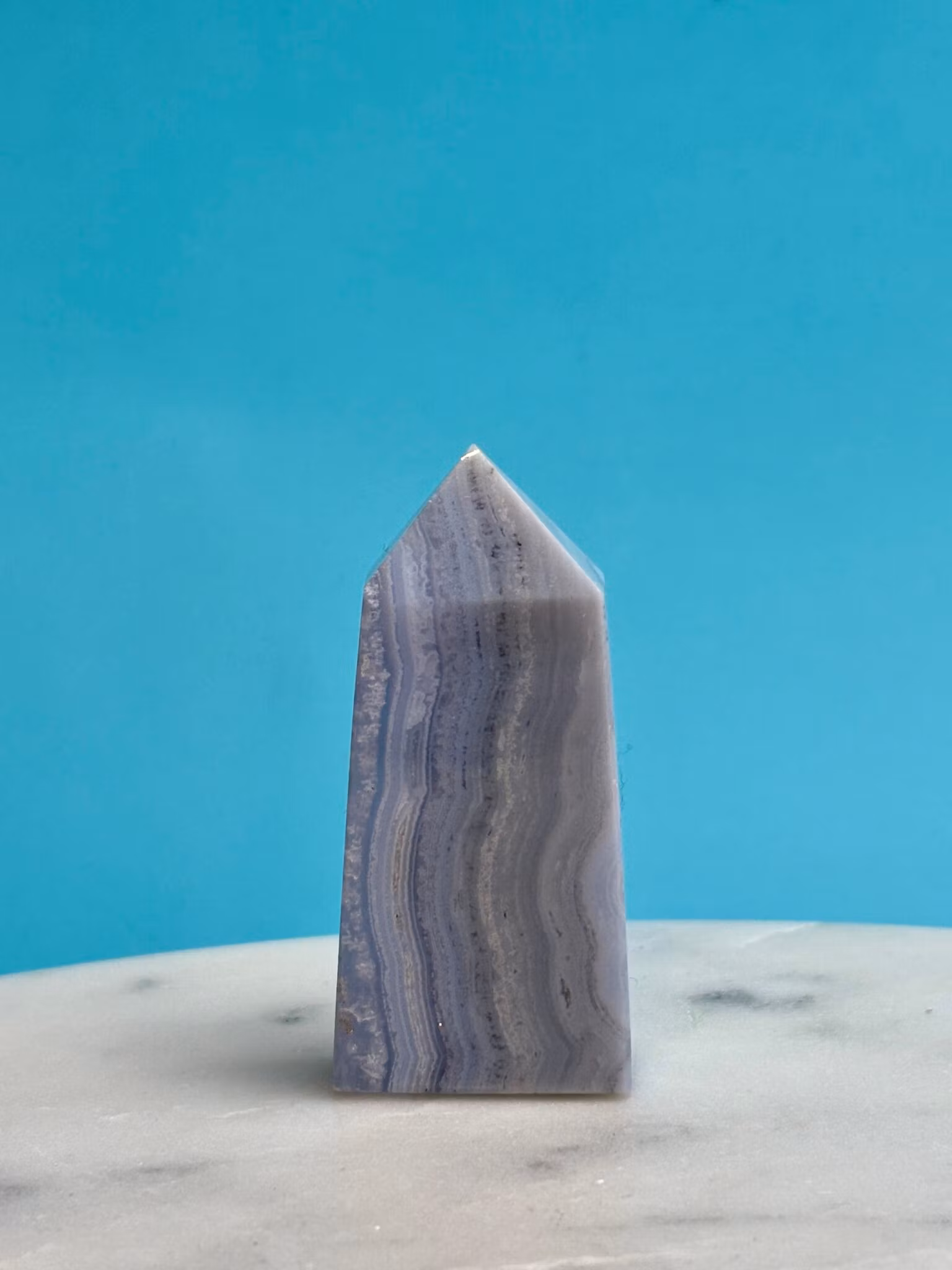 Blue Lace Agat, som även är känd som Blå Bandagat, är en lugnande kristall som utstrålar mjuk energi och harmoni. Den påminner oss om frihetens och skönhetens betydelse i livet. Det är en kristall som sägs vara bra att använda vid kommunikation då den hjälper dig att tala sanning. Kristallen kan användas när du behöver inspireras av lätta energier runt omkring dig