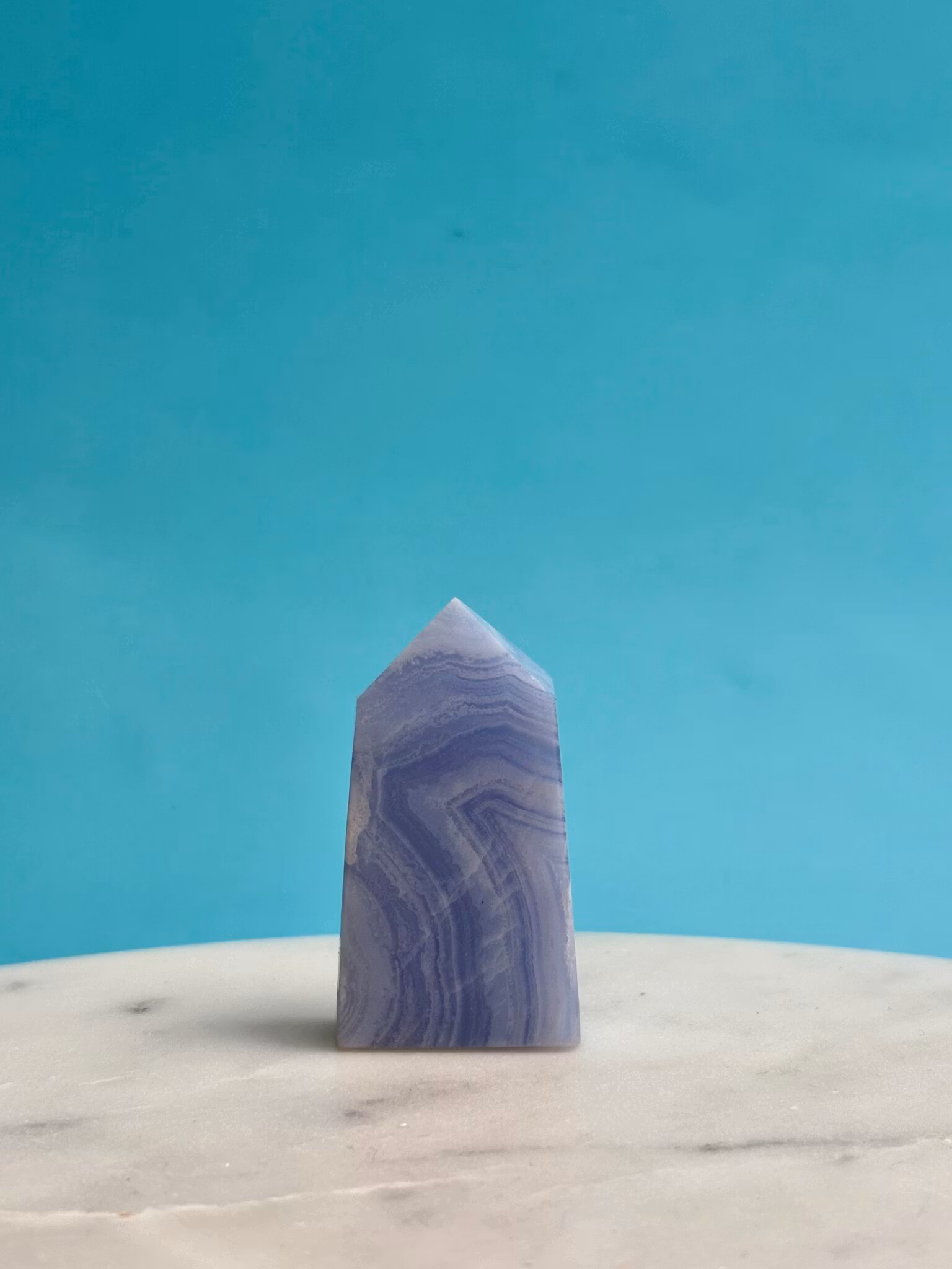 Blue Lace Agat, som även är känd som Blå Bandagat, är en lugnande kristall som utstrålar mjuk energi och harmoni. Den påminner oss om frihetens och skönhetens betydelse i livet. Det är en kristall som sägs vara bra att använda vid kommunikation då den hjälper dig att tala sanning. Kristallen kan användas när du behöver inspireras av lätta energier runt omkring dig