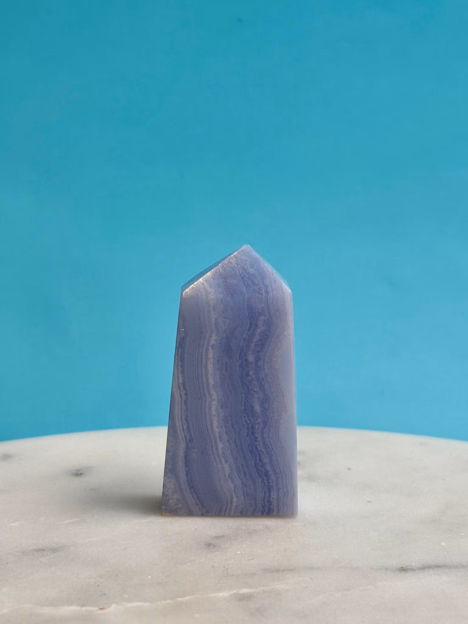 Blue Lace Agat, som även är känd som Blå Bandagat, är en lugnande kristall som utstrålar mjuk energi och harmoni. Den påminner oss om frihetens och skönhetens betydelse i livet. Det är en kristall som sägs vara bra att använda vid kommunikation då den hjälper dig att tala sanning. Kristallen kan användas när du behöver inspireras av lätta energier runt omkring dig