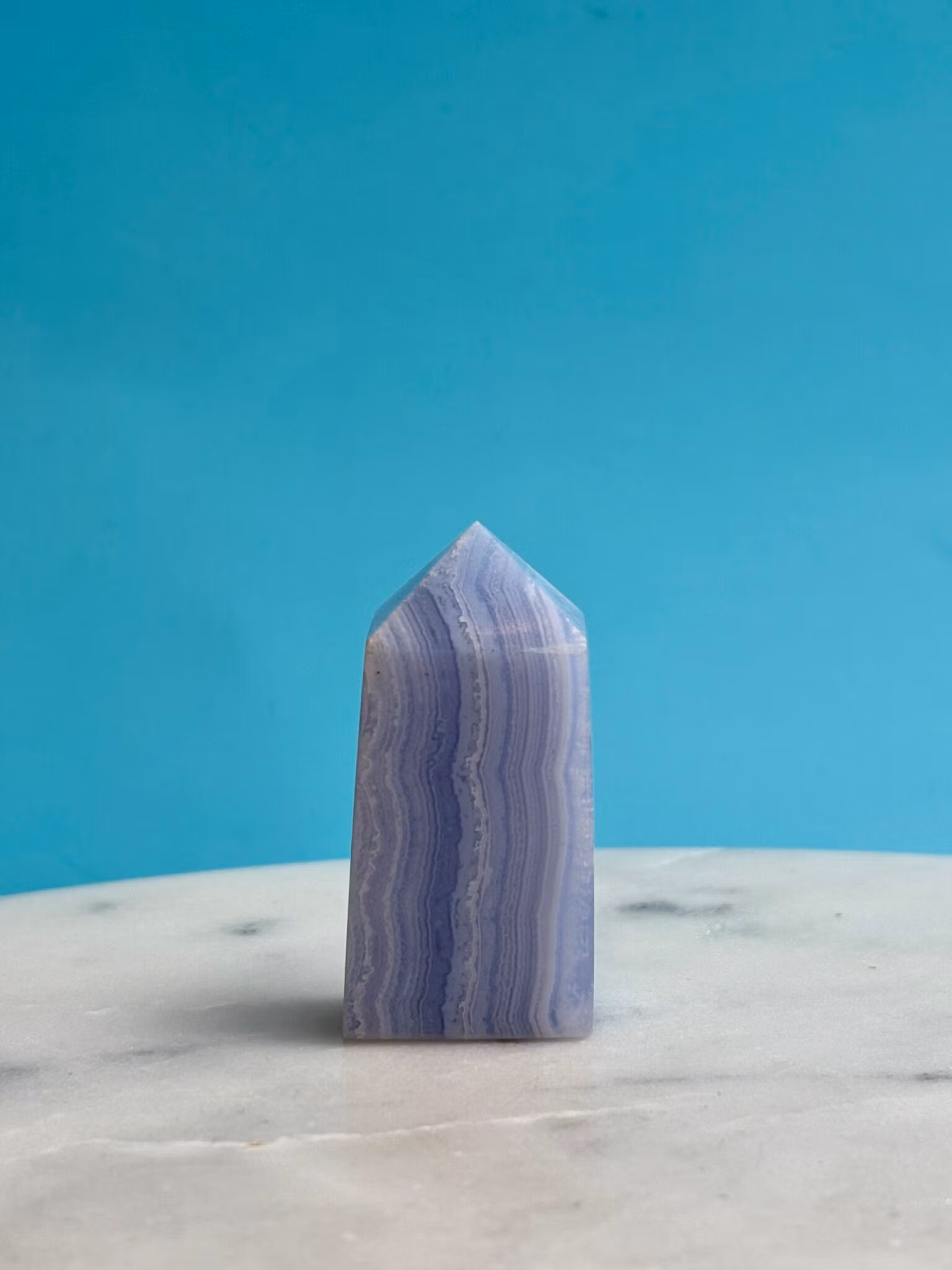 Blue Lace Agat, som även är känd som Blå Bandagat, är en lugnande kristall som utstrålar mjuk energi och harmoni. Den påminner oss om frihetens och skönhetens betydelse i livet. Det är en kristall som sägs vara bra att använda vid kommunikation då den hjälper dig att tala sanning. Kristallen kan användas när du behöver inspireras av lätta energier runt omkring dig