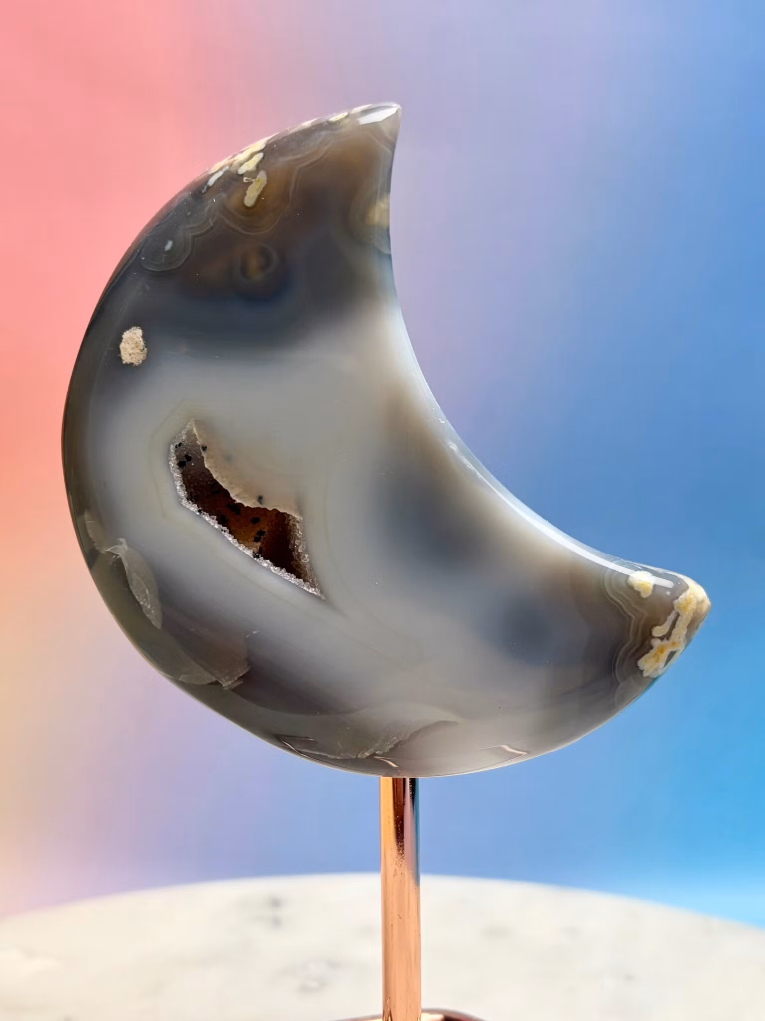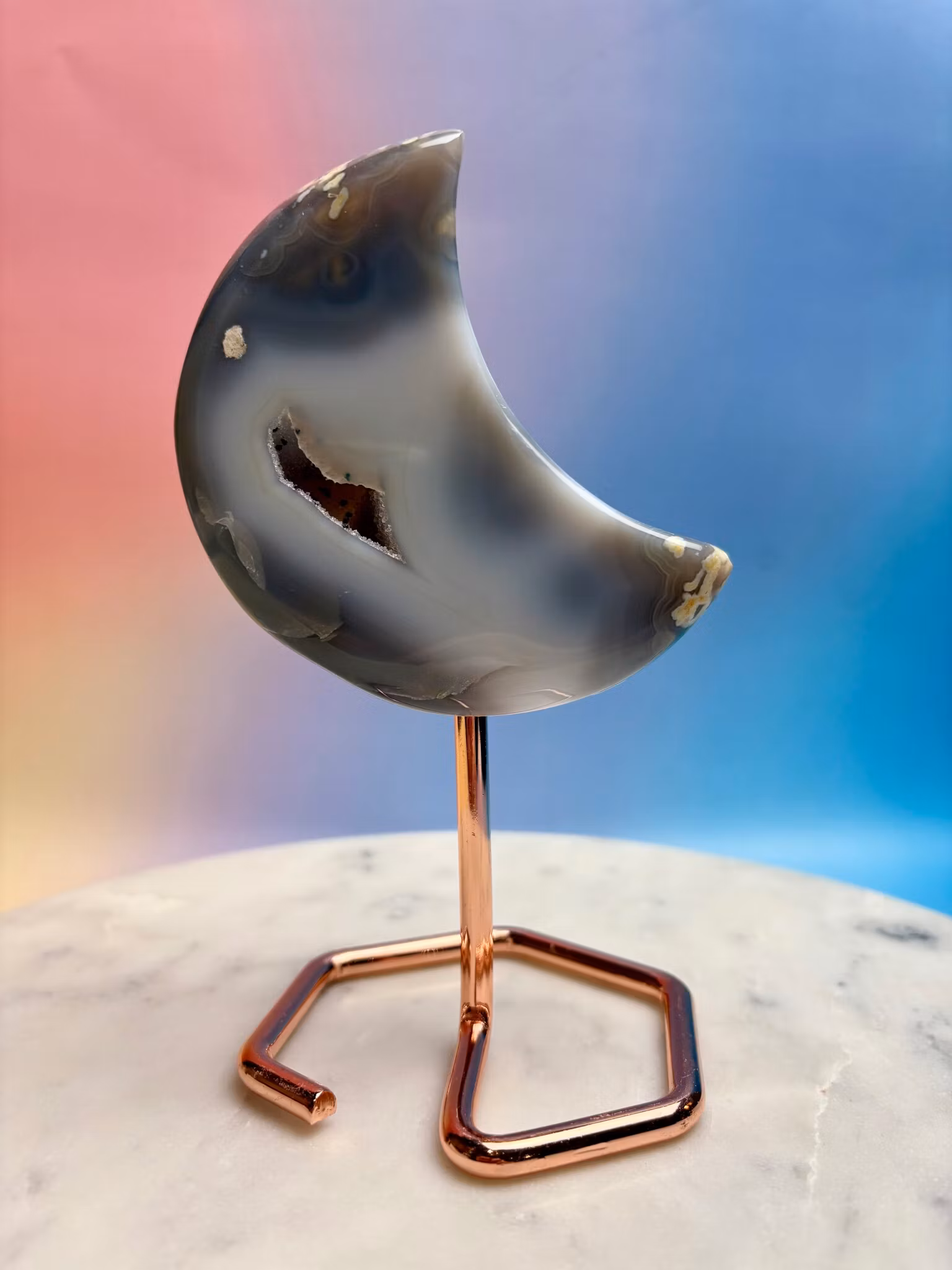 Agat är känd som en jordande sten som hjälper dig att finna lugn i en hektisk värld. Dess milda men kraftfulla energi verkar långsamt och stabiliserar känslor, vilket gör den perfekt för dig som söker inre frid och mental klarhet. Bär den som en kraftkälla. Placera den i ditt hem. Låt agat guida dig till ett liv i harmoni.