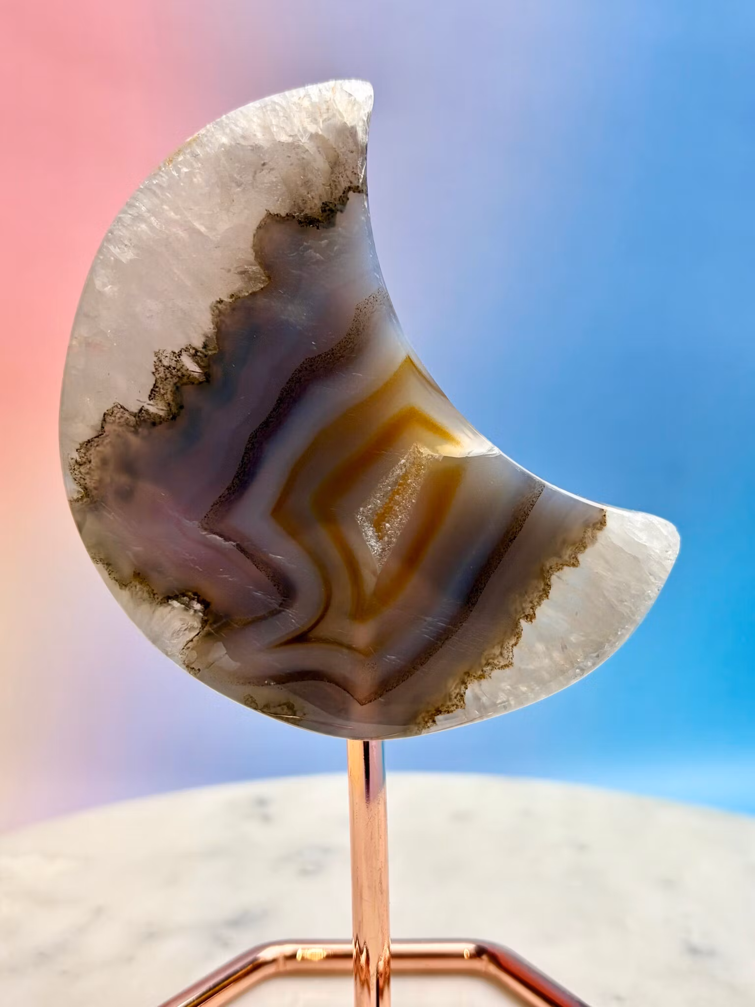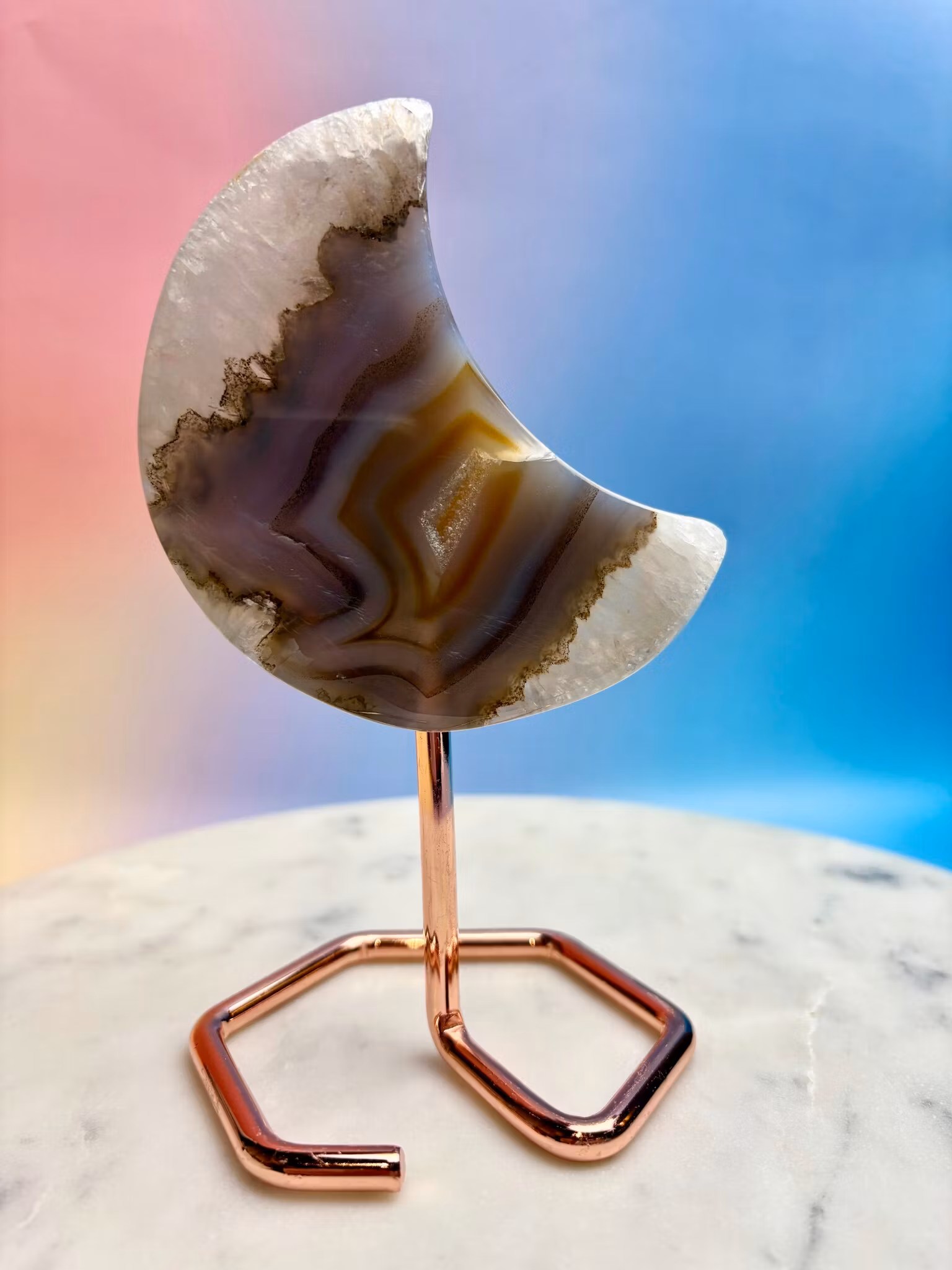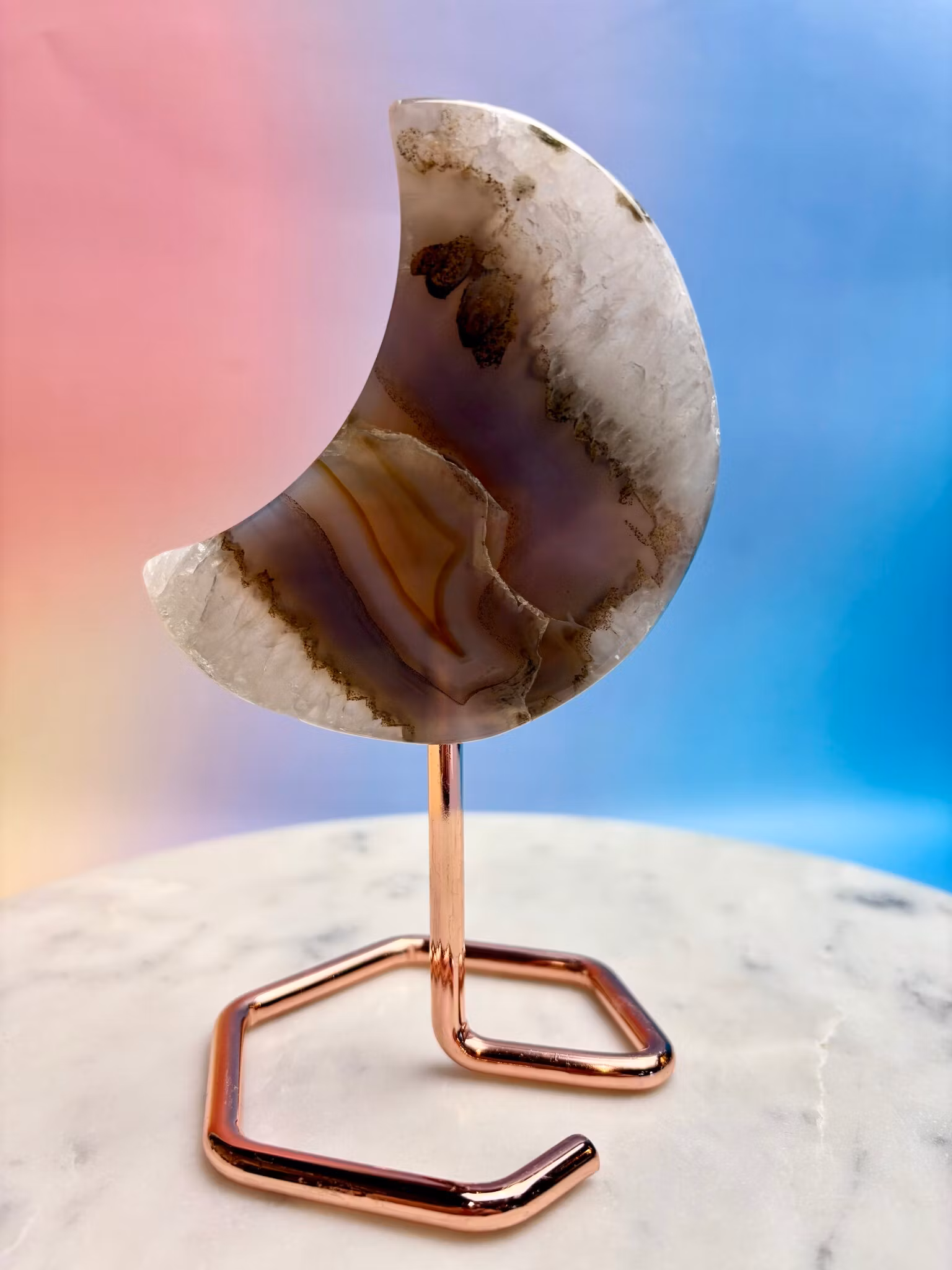 Agat är känd som en jordande sten som hjälper dig att finna lugn i en hektisk värld. Dess milda men kraftfulla energi verkar långsamt och stabiliserar känslor, vilket gör den perfekt för dig som söker inre frid och mental klarhet. Bär den som en kraftkälla. Placera den i ditt hem. Låt agat guida dig till ett liv i harmoni.