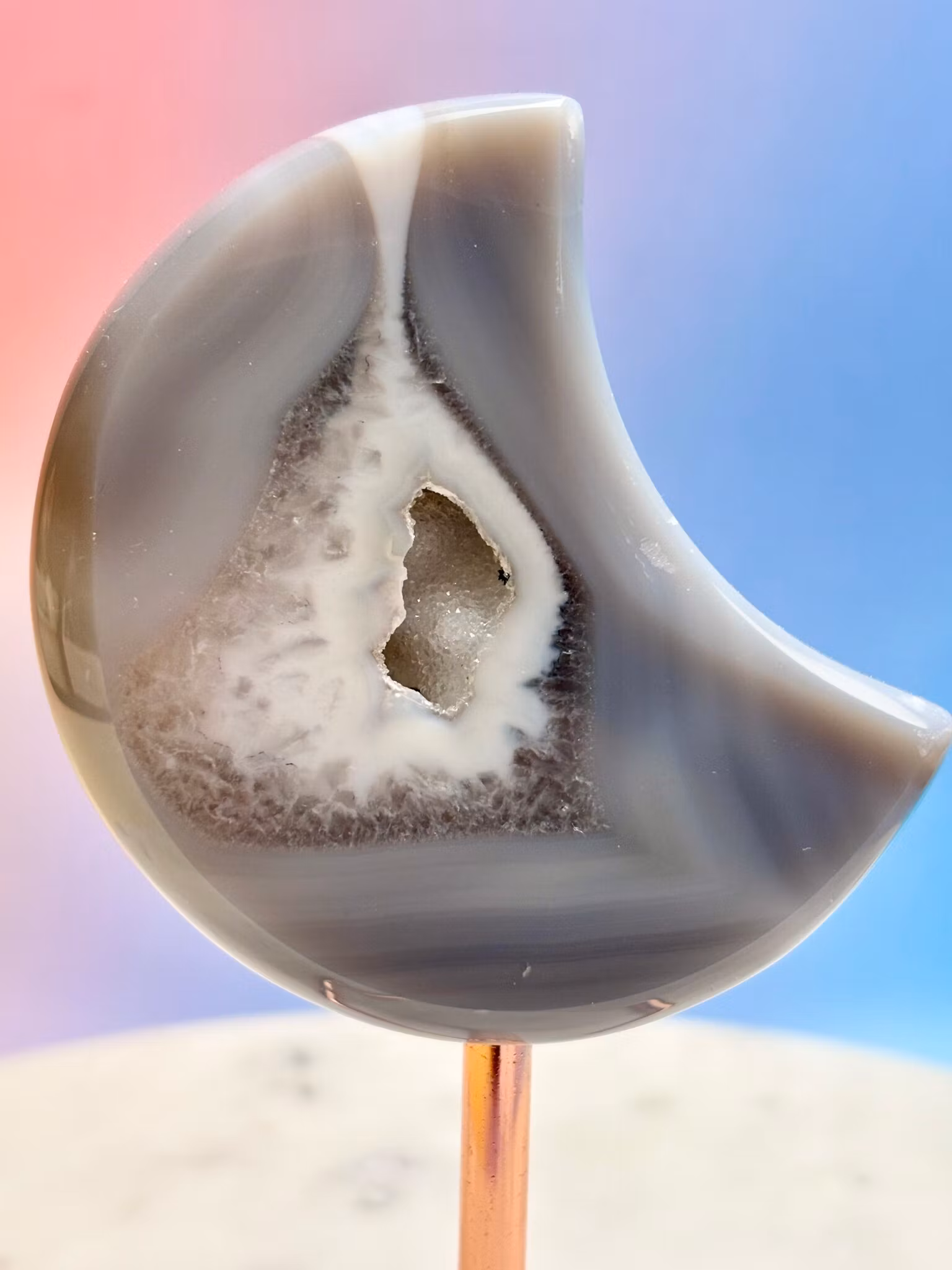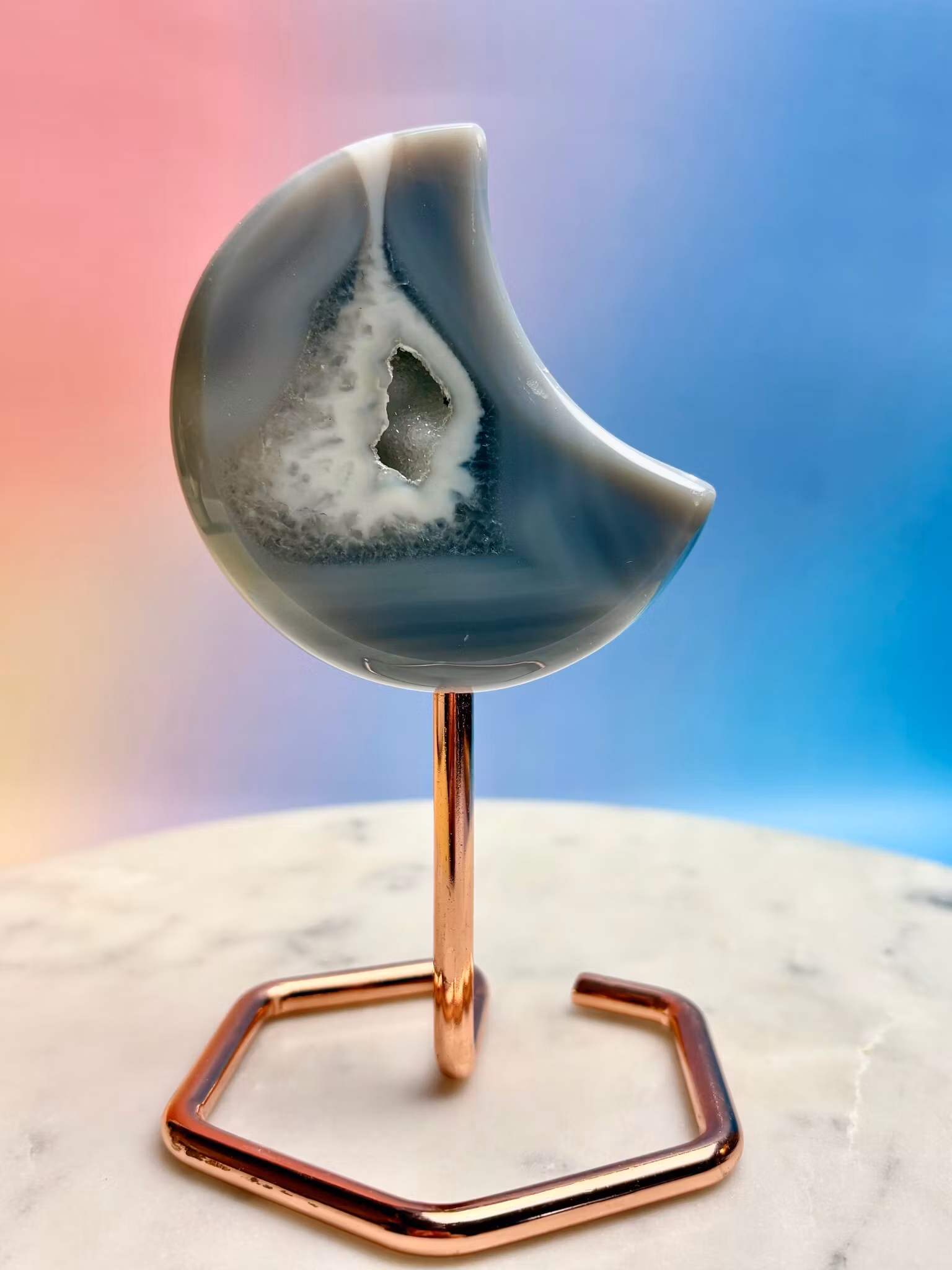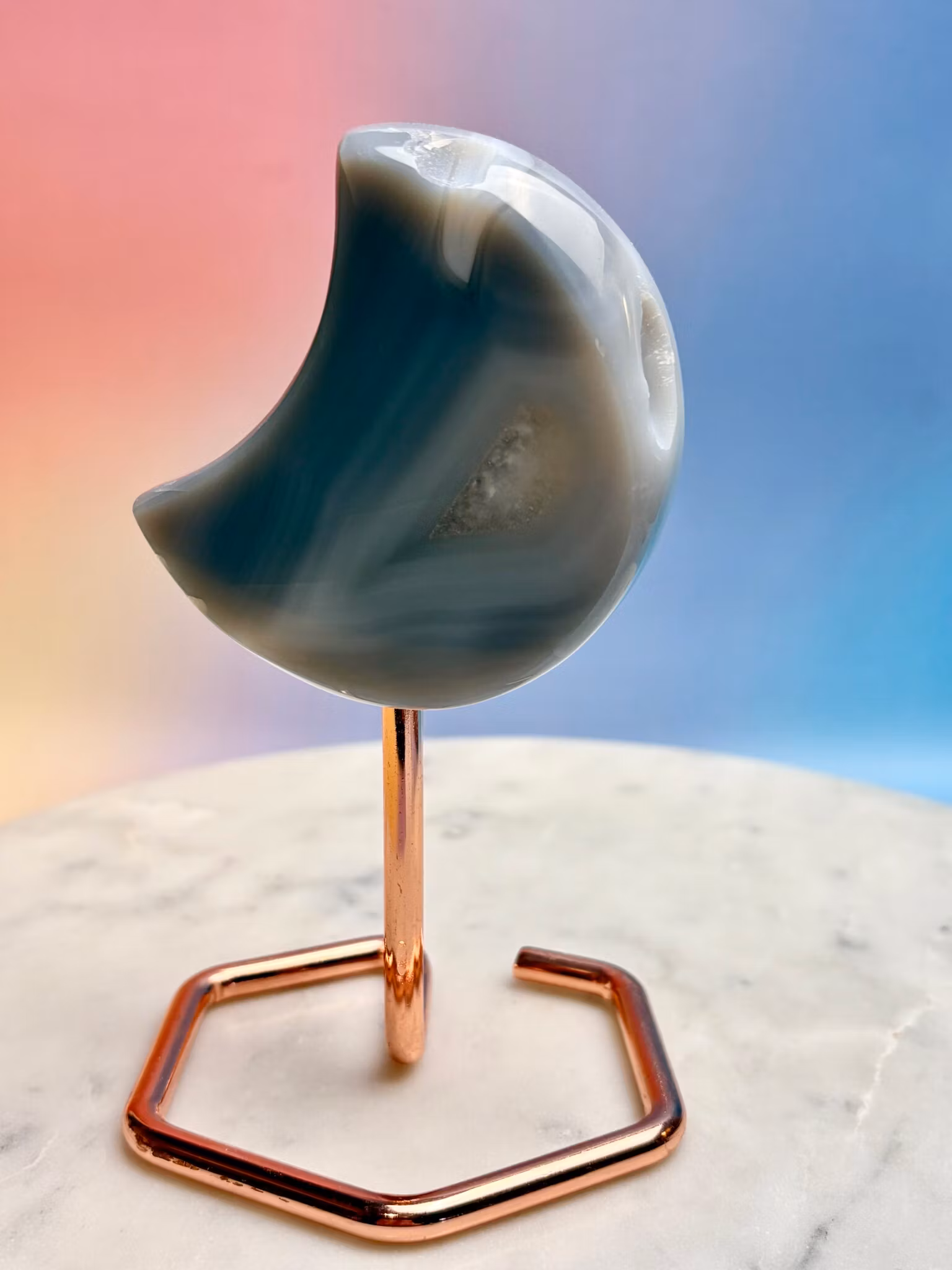 Agat är känd som en jordande sten som hjälper dig att finna lugn i en hektisk värld. Dess milda men kraftfulla energi verkar långsamt och stabiliserar känslor, vilket gör den perfekt för dig som söker inre frid och mental klarhet. Bär den som en kraftkälla. Placera den i ditt hem. Låt agat guida dig till ett liv i harmoni.