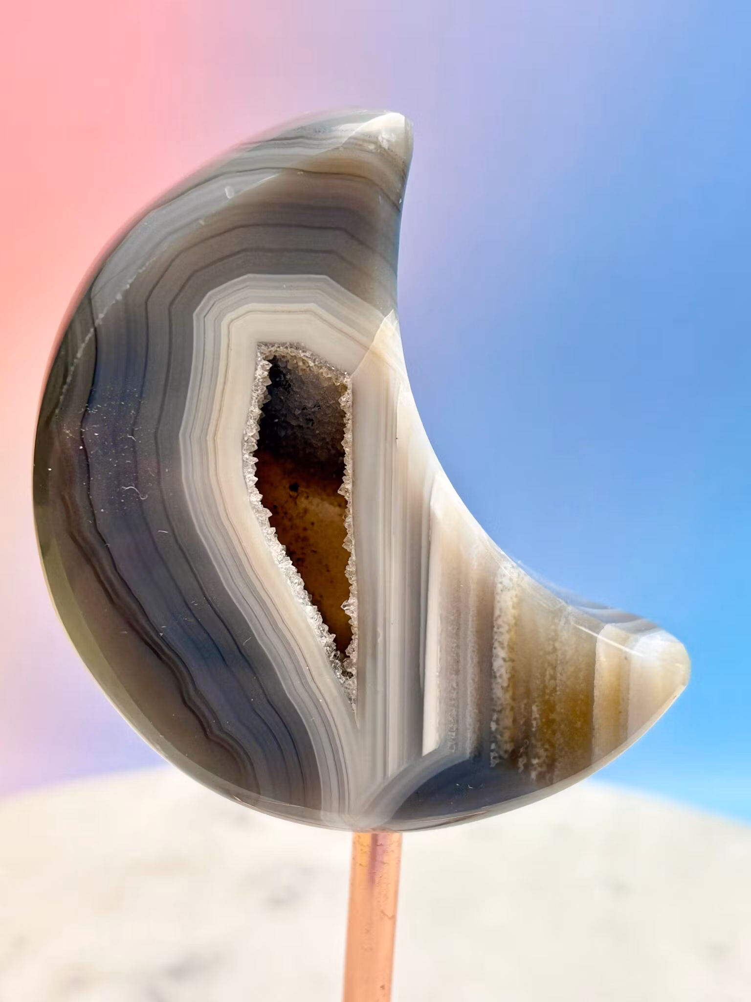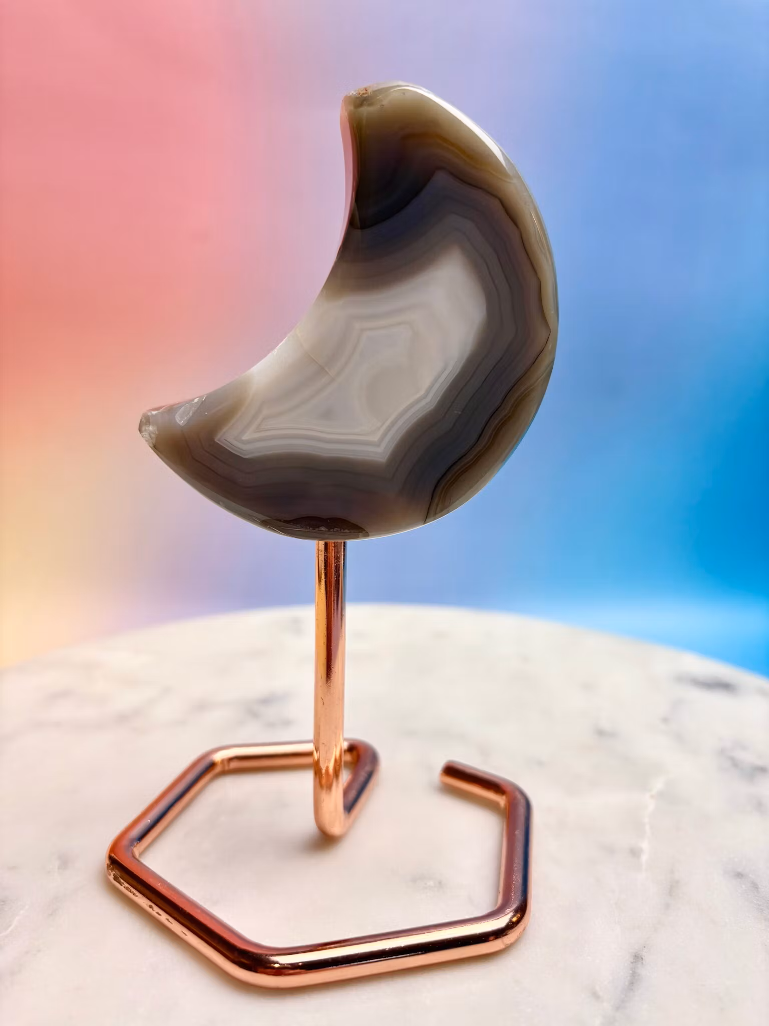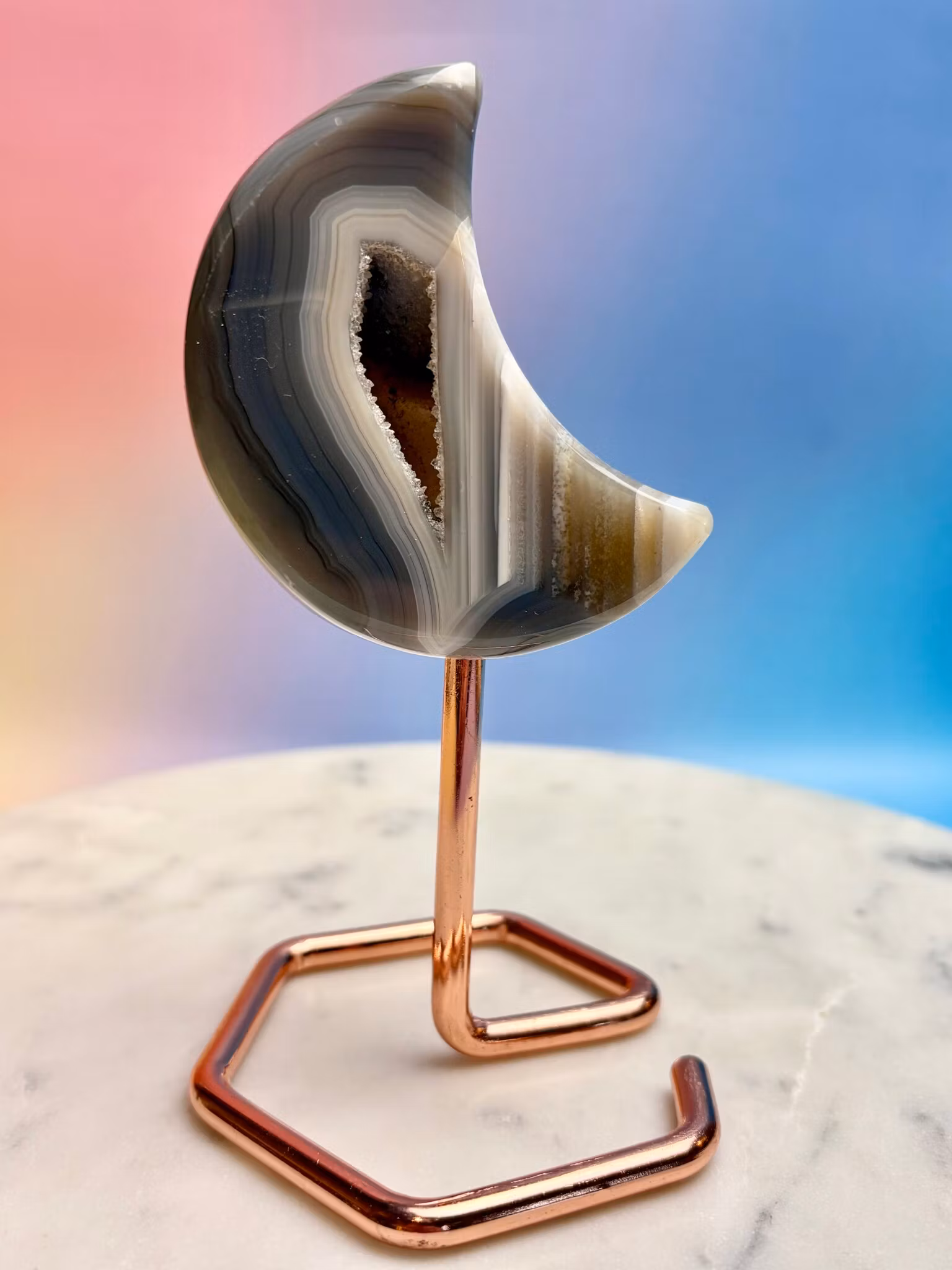 Agat är känd som en jordande sten som hjälper dig att finna lugn i en hektisk värld. Dess milda men kraftfulla energi verkar långsamt och stabiliserar känslor, vilket gör den perfekt för dig som söker inre frid och mental klarhet. Bär den som en kraftkälla. Placera den i ditt hem. Låt agat guida dig till ett liv i harmoni.