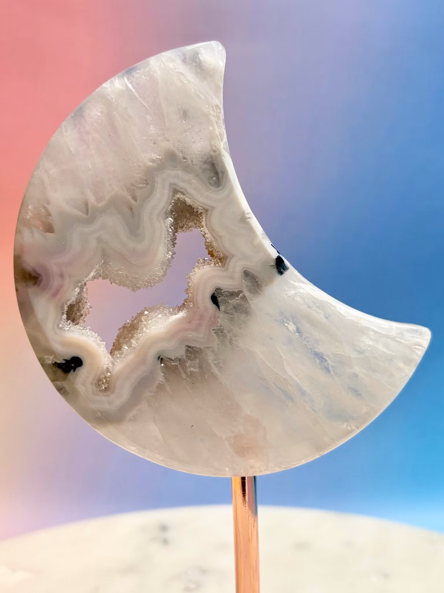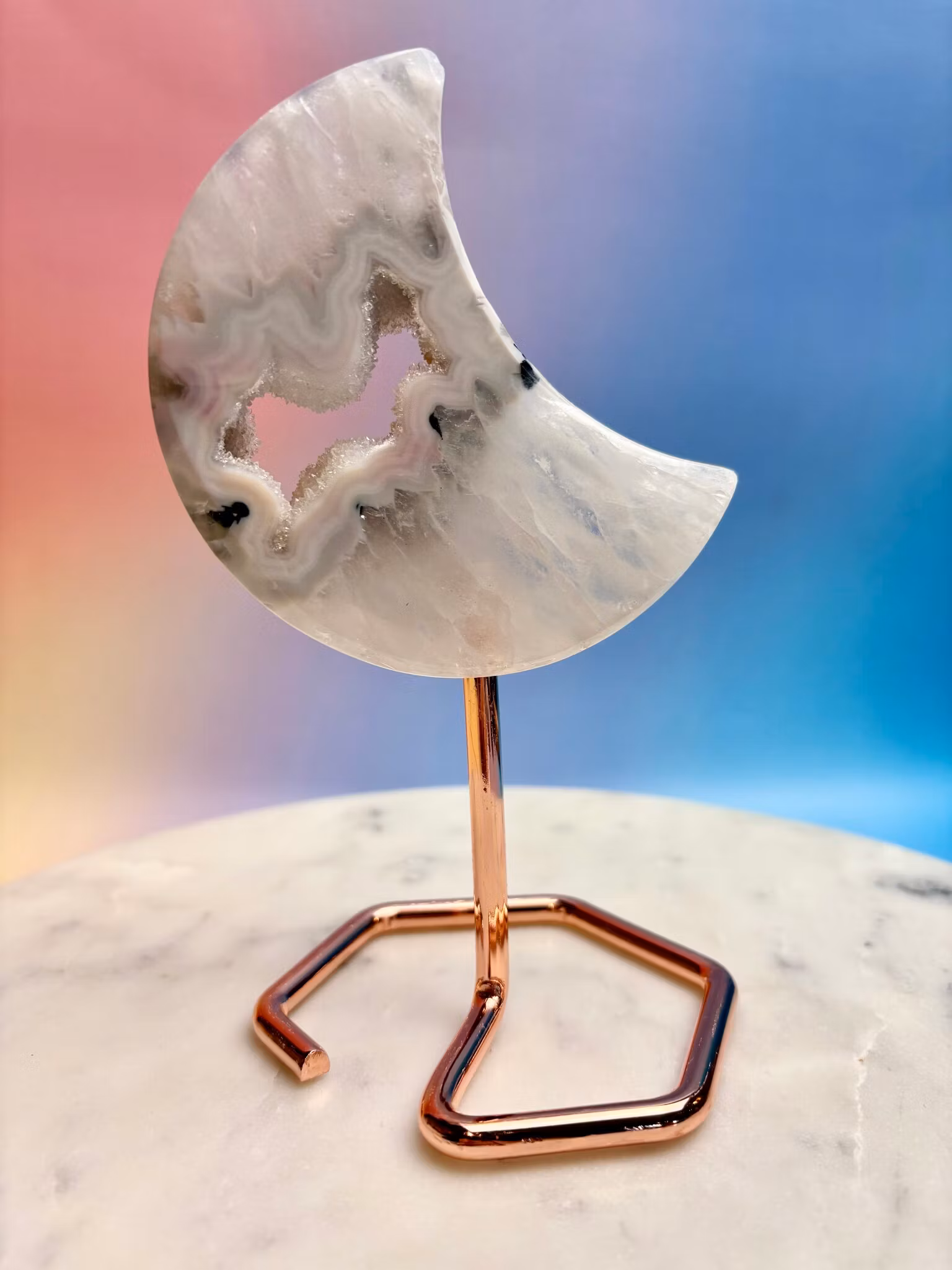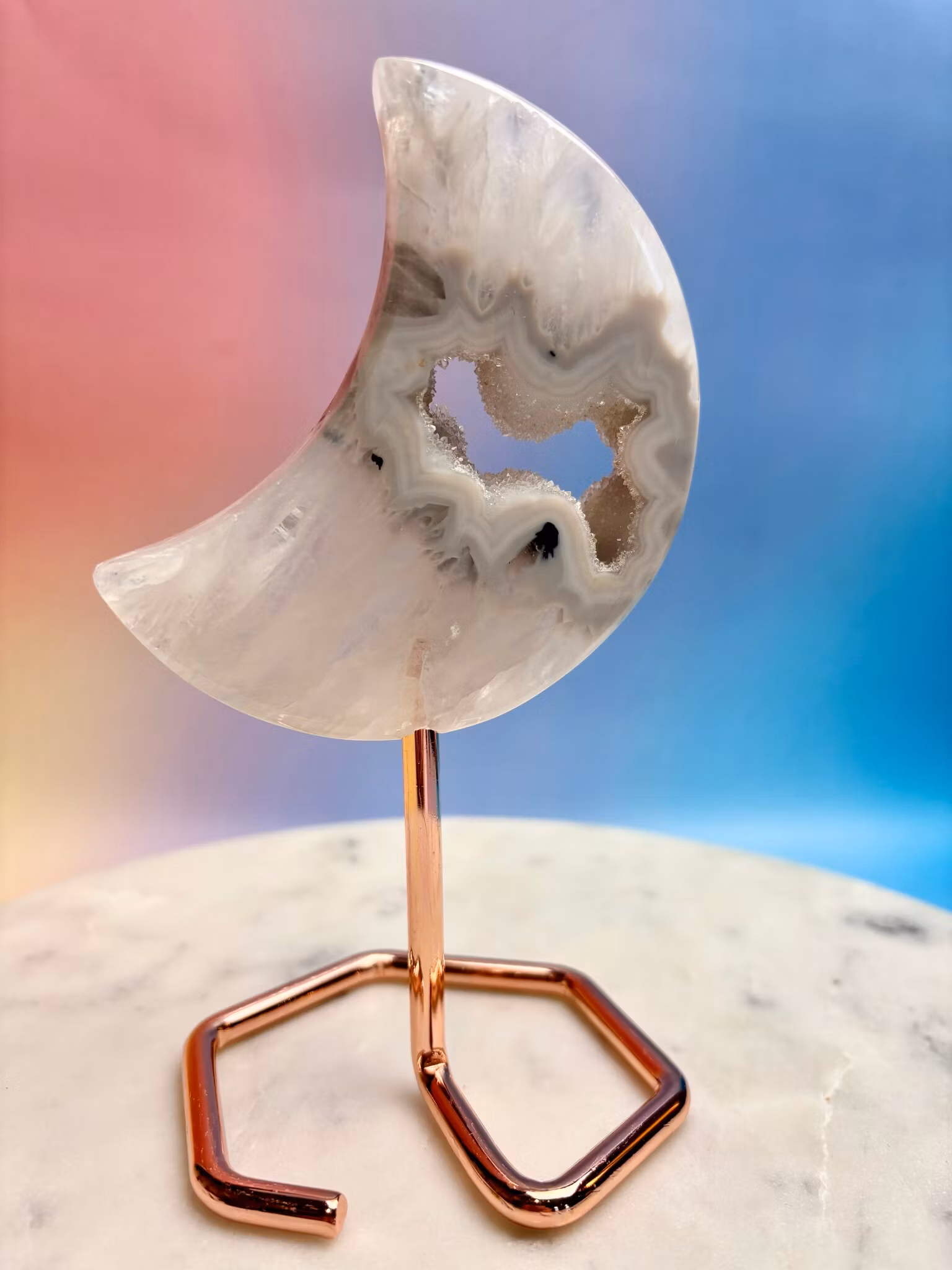 Agat är känd som en jordande sten som hjälper dig att finna lugn i en hektisk värld. Dess milda men kraftfulla energi verkar långsamt och stabiliserar känslor, vilket gör den perfekt för dig som söker inre frid och mental klarhet. Bär den som en kraftkälla. Placera den i ditt hem. Låt agat guida dig till ett liv i harmoni.