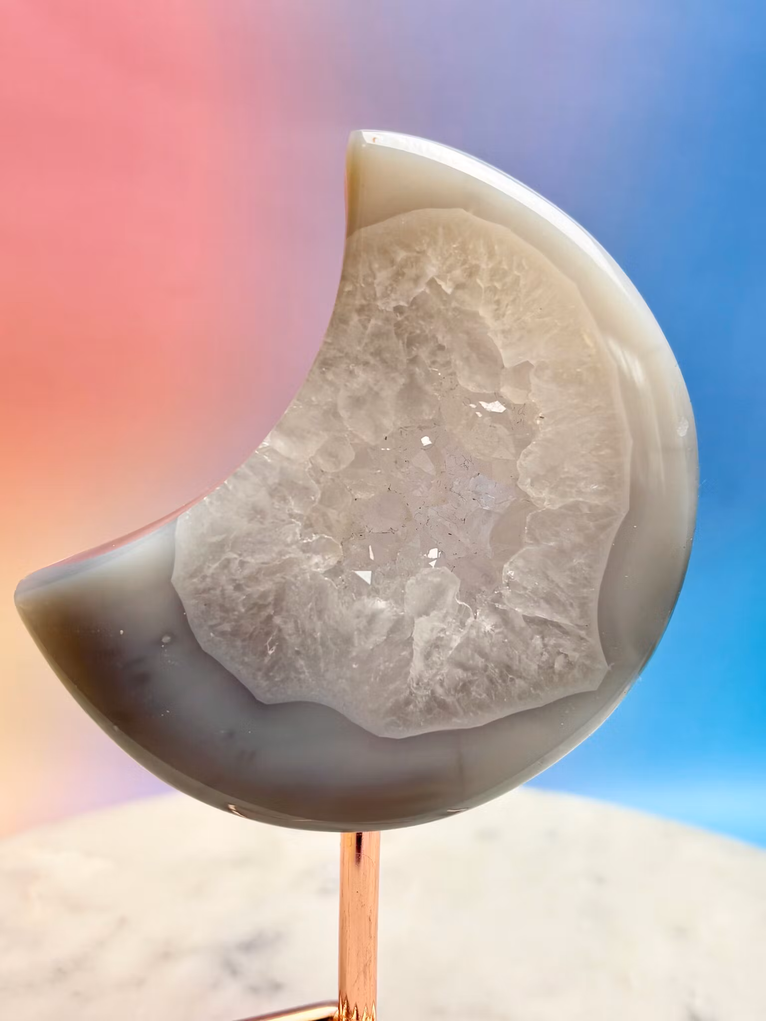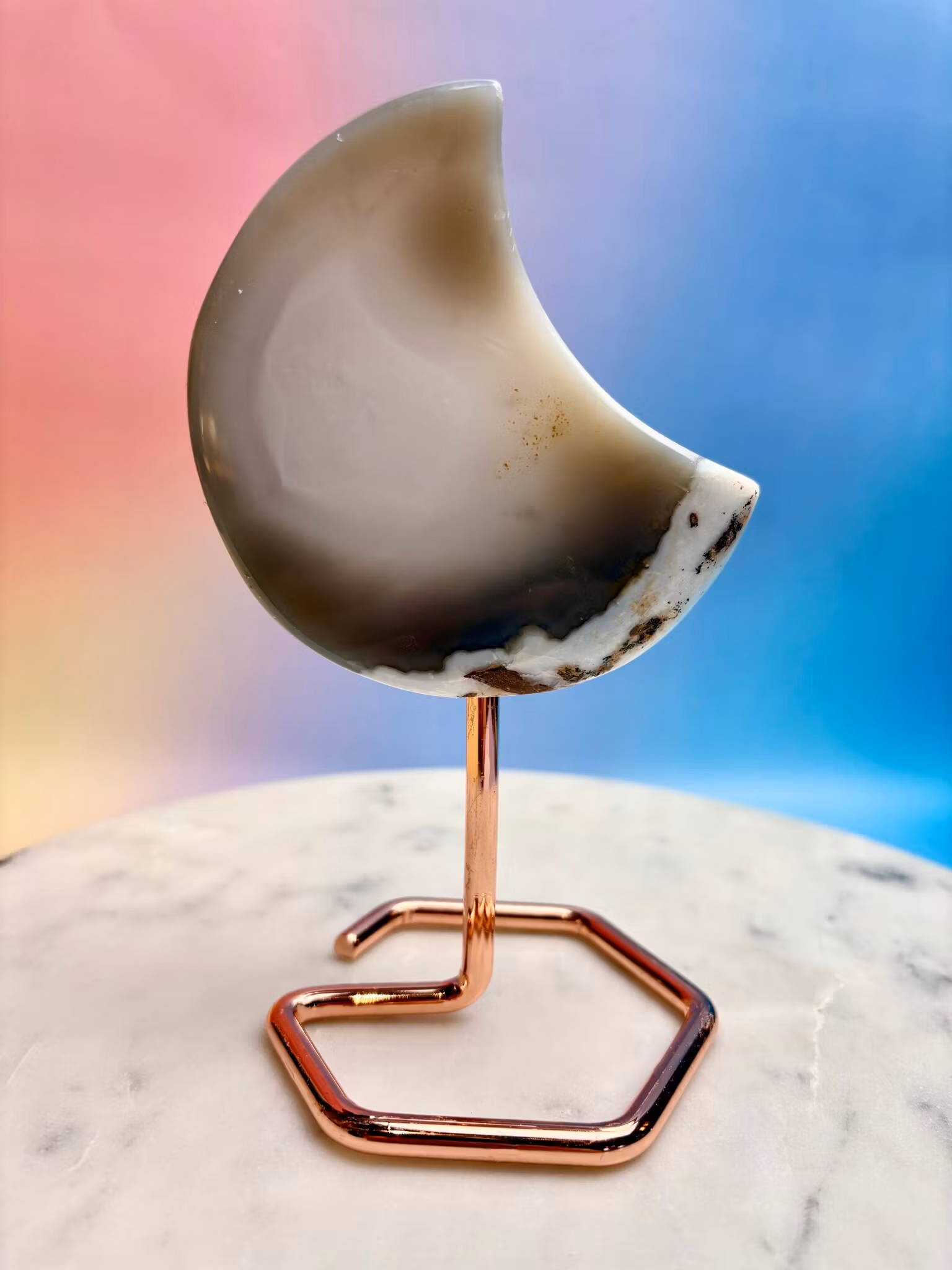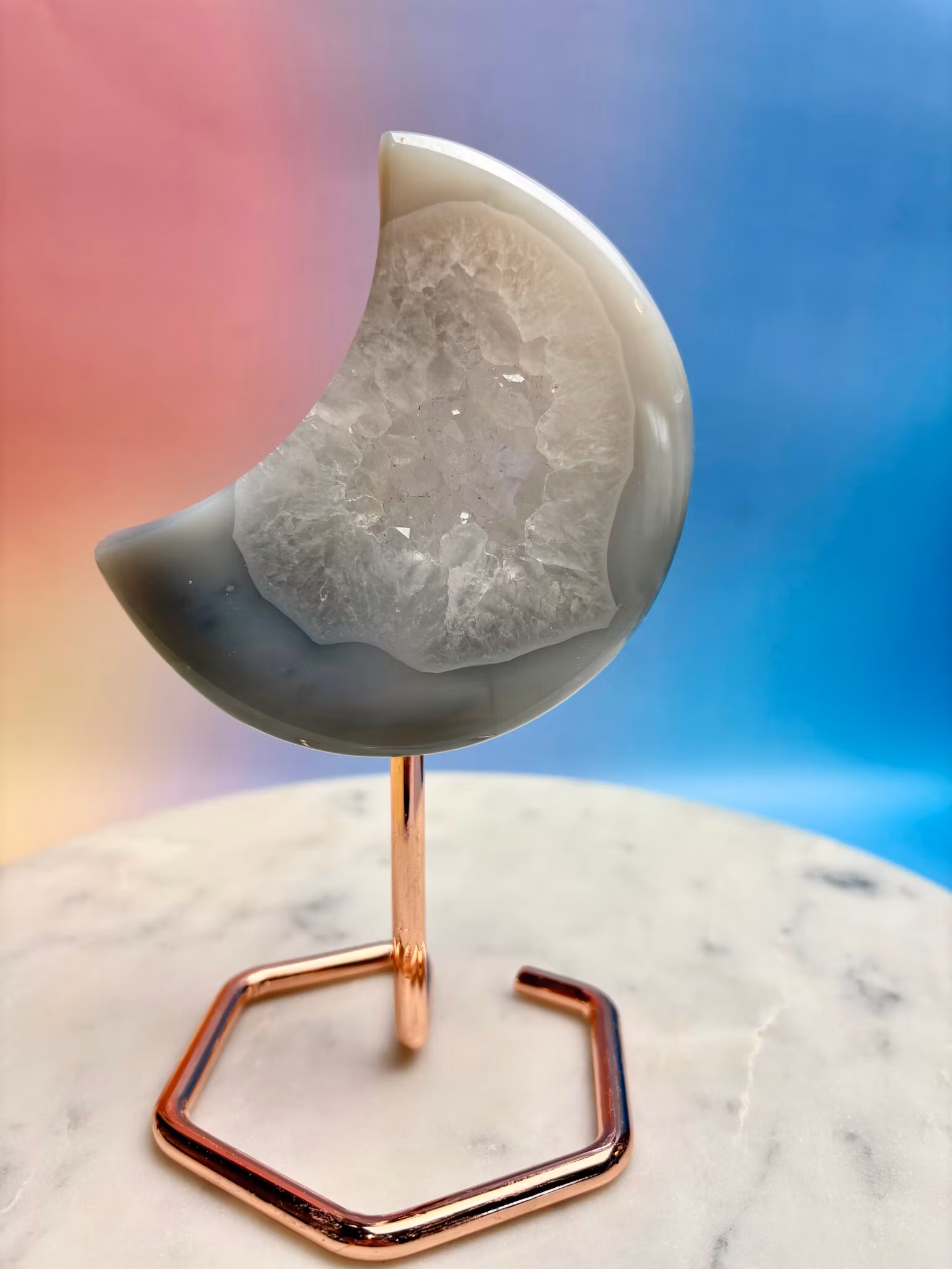 Agat är känd som en jordande sten som hjälper dig att finna lugn i en hektisk värld. Dess milda men kraftfulla energi verkar långsamt och stabiliserar känslor, vilket gör den perfekt för dig som söker inre frid och mental klarhet. Bär den som en kraftkälla. Placera den i ditt hem. Låt agat guida dig till ett liv i harmoni.
