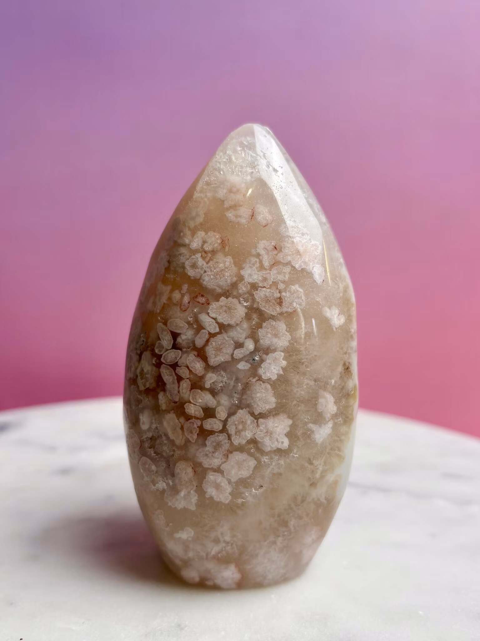 Blomsteragat påminner oss om att livet är en resa av ständig tillväxt och att vi har kraften och är kapabla till att blomstra och nå vår fulla potential. Med sin upplyftande energi stärker kristallen vår vilja att följa våra drömmar och ger oss modet att ta oss an nya projekt eller kapitel i livet. Kristallen står därför även för nystart och hjälper oss att känna tillit till att allt ordnar sig, även under förändringens tid.