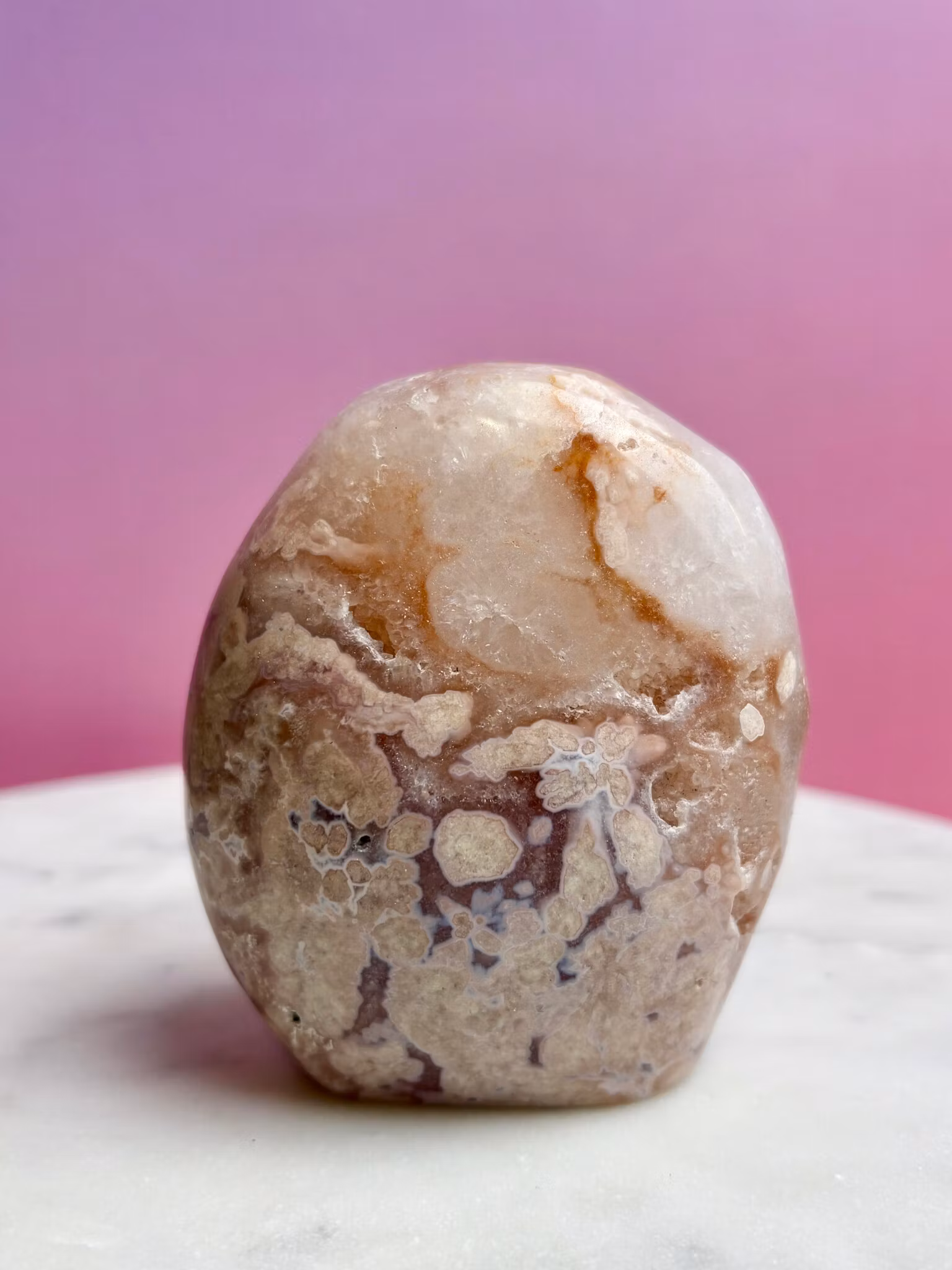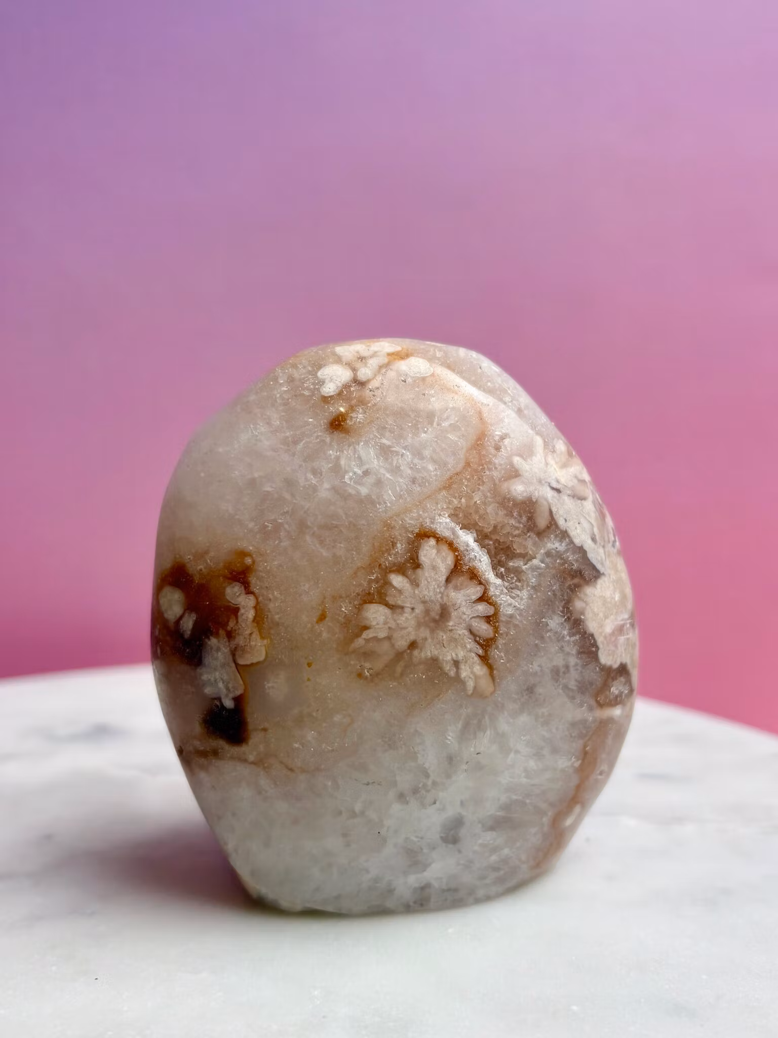 Blomsteragat påminner oss om att livet är en resa av ständig tillväxt och att vi har kraften och är kapabla till att blomstra och nå vår fulla potential. Med sin upplyftande energi stärker kristallen vår vilja att följa våra drömmar och ger oss modet att ta oss an nya projekt eller kapitel i livet. Kristallen står därför även för nystart och hjälper oss att känna tillit till att allt ordnar sig, även under förändringens tid.