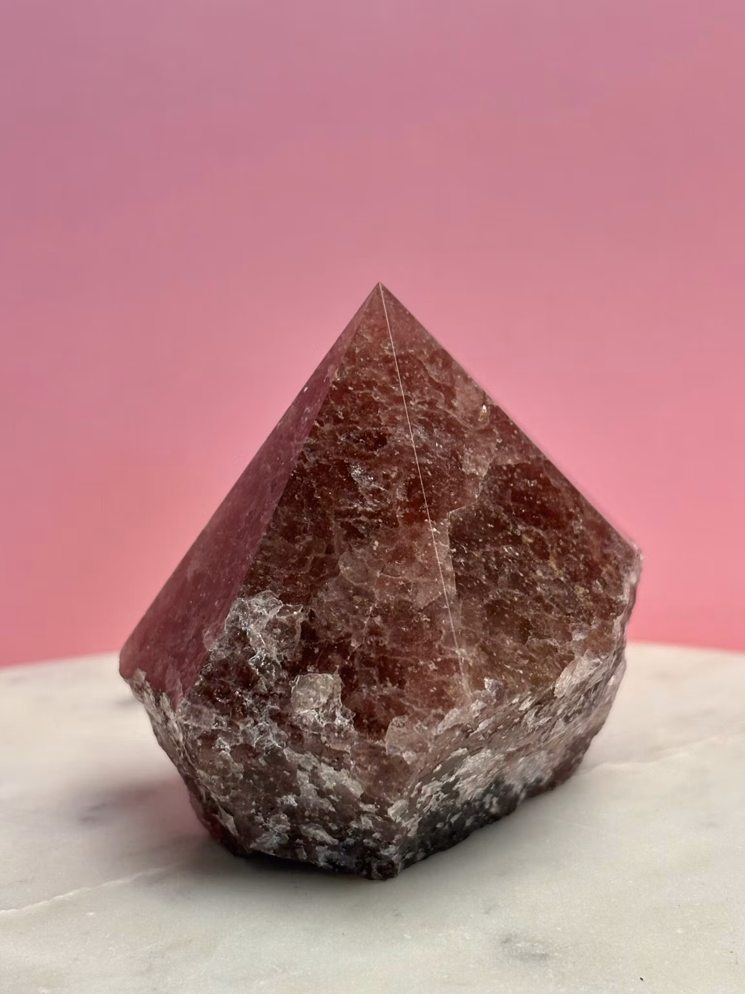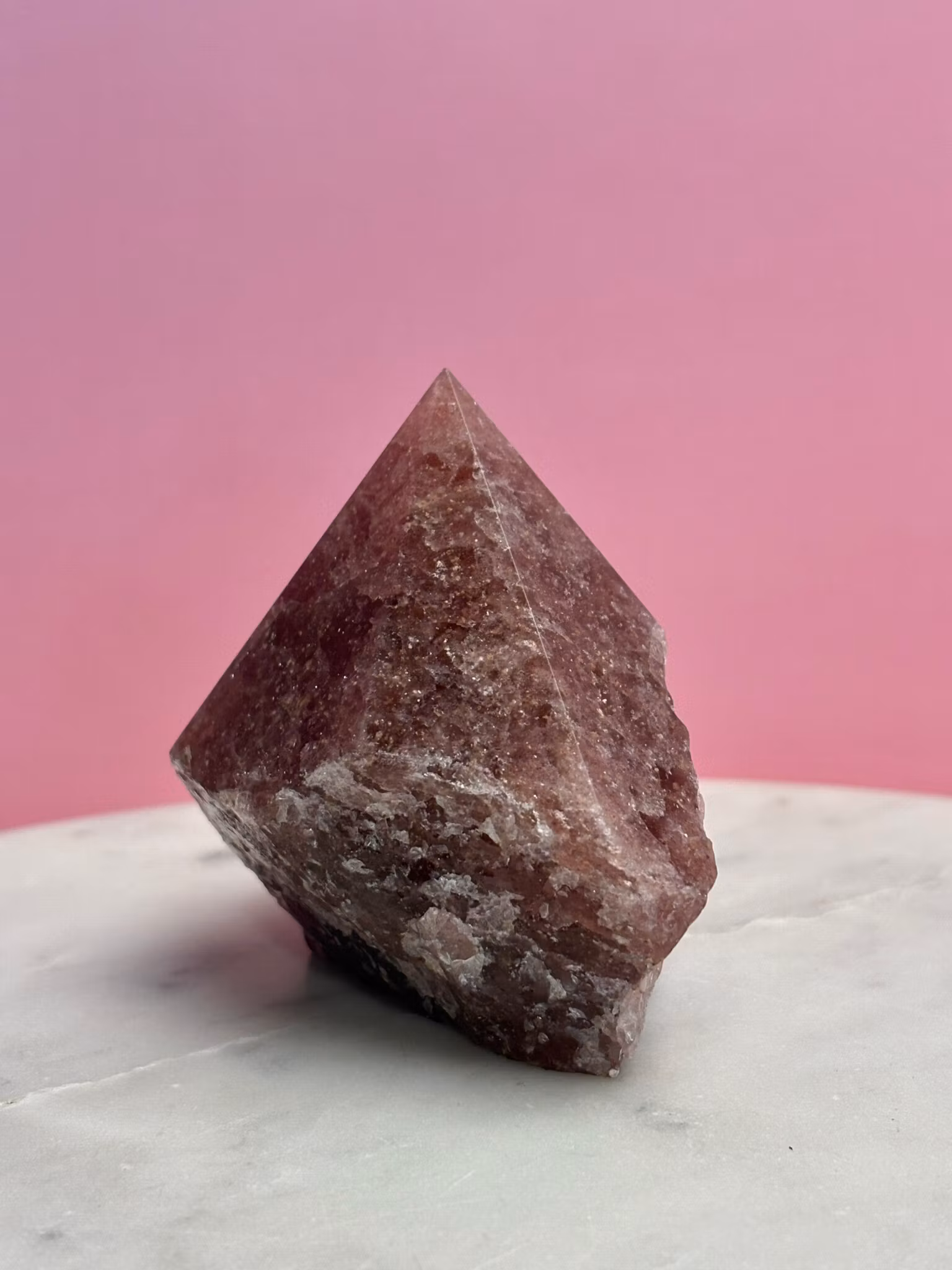 Jordgubbskvarts är en rosa kvarts full av kärlek och ljus, med sin unika nyans och glittrande prickar som påminner om en solnedgång eller sommarens första jordgubbar. Den är känd för att hjälpa till att locka till sig sin ‘’soulmate’’ genom att öppna hjärtat och främja kommunikation. Dess energi sägs ge en känsla av lugn, balans och tacksamhet och påminner dig om att verkligen ta vara på livet. Jordgubbskvarts uppmuntrar dig att släppa gamla sår, vara närvarande i nuet och omfamna kärleken – både inom dig själv och i dina relationer.