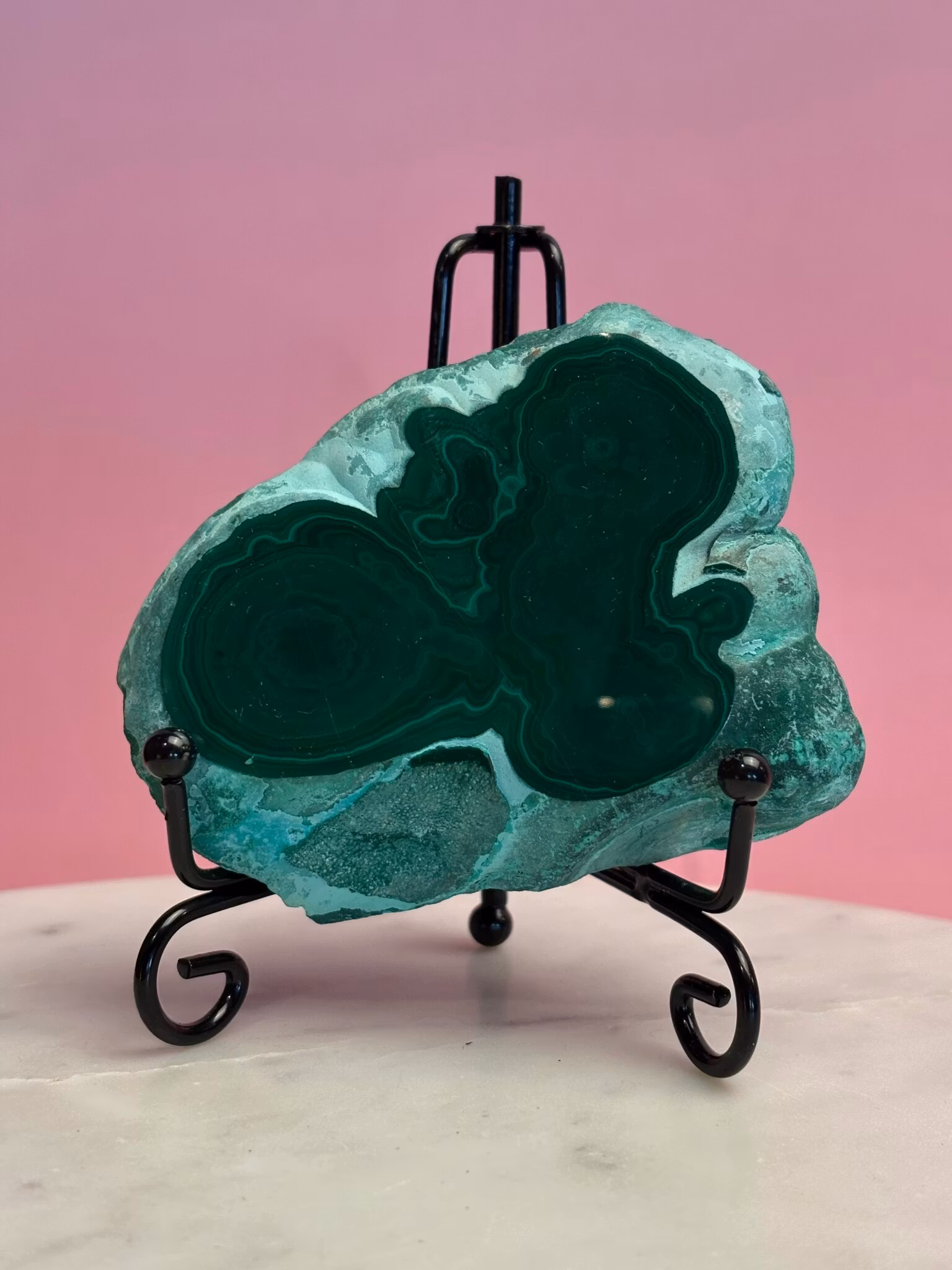 Magisk slab i Krysokolla! Den är en sten för kommunikation, harmoni och känslomässig balans, och dess energi hjälper till att lindra stress, stärka självuttryck och främja inre visdom. Perfekt att ha i ditt arbetsrum eller sovrum för att skapa en fridfull och harmonisk atmosfär.