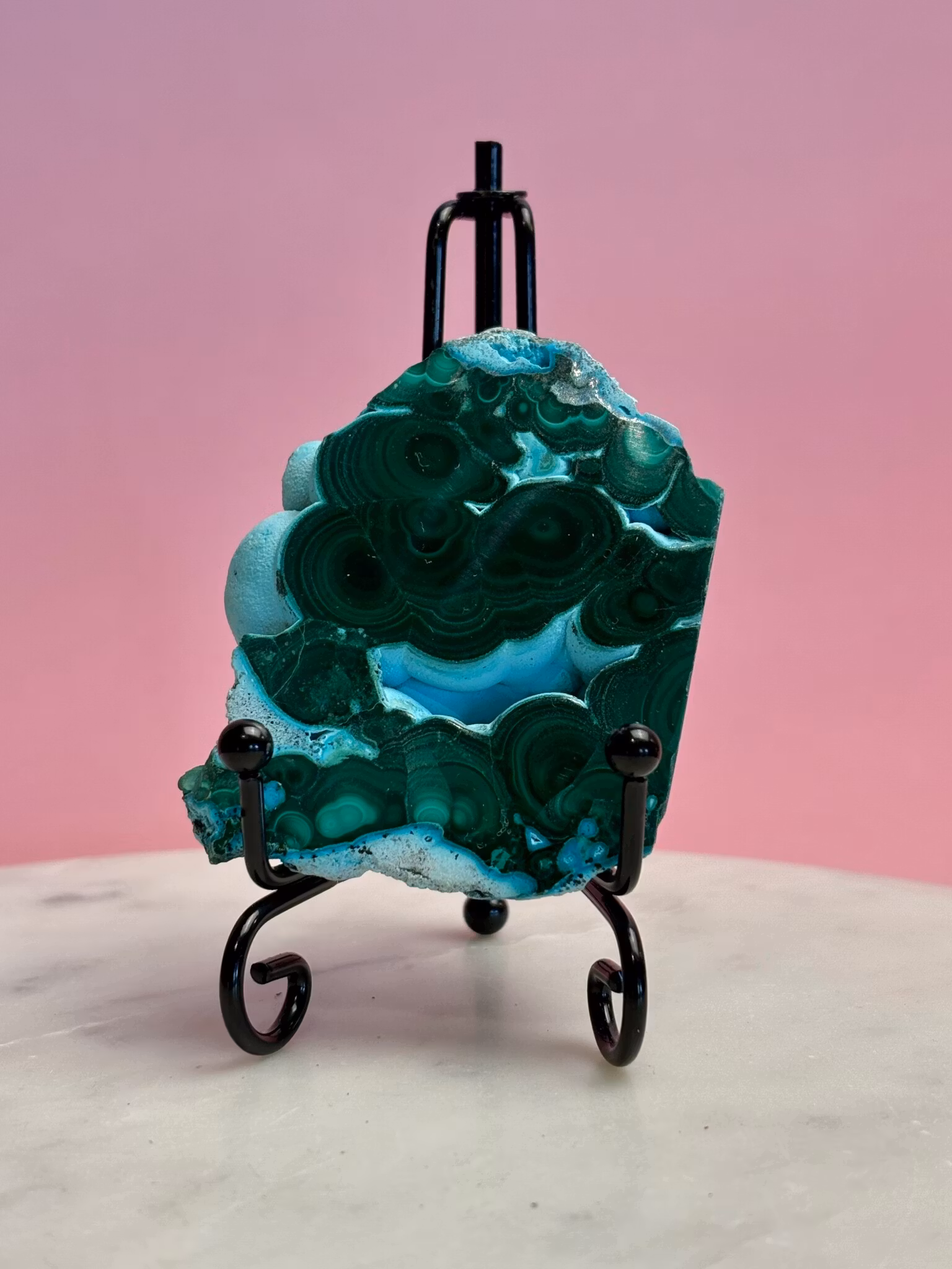 Magisk slab i Krysokolla! Den är en sten för kommunikation, harmoni och känslomässig balans, och dess energi hjälper till att lindra stress, stärka självuttryck och främja inre visdom. Perfekt att ha i ditt arbetsrum eller sovrum för att skapa en fridfull och harmonisk atmosfär.
