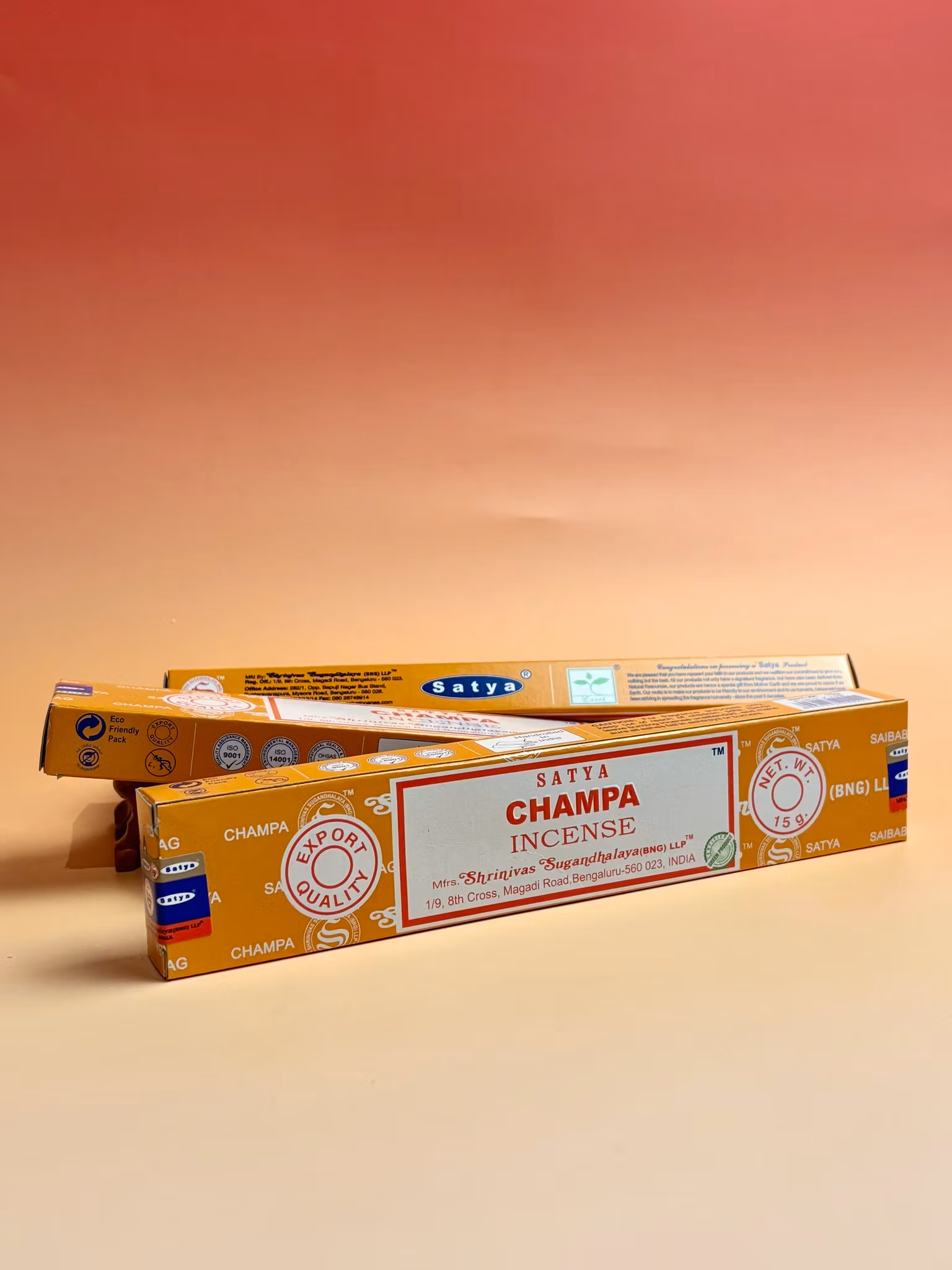 Om Champa: Satya Champa-rökelsen har en mjuk, blommig och lätt söt doft med inslag av sandelträ och exotiska örter. Inspirerad av den ikoniska Nag Champa-doften, skapar den en fridfull och meditativ atmosfär. Perfekt för avslappning, andligt arbete och energirening, denna doft hjälper till att höja sinnet och skapa en känsla av harmoni och välbefinnande.