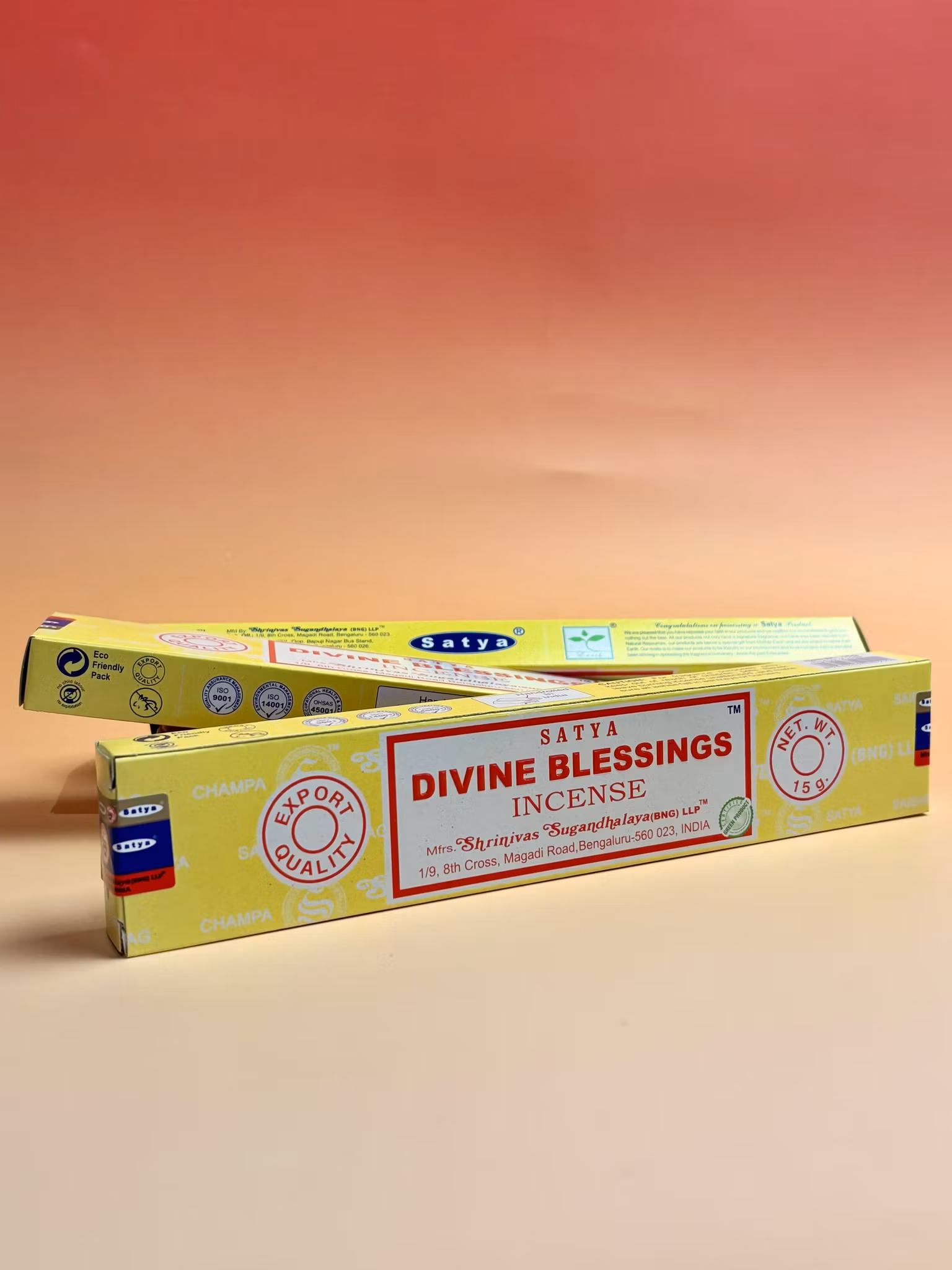 Om Divine Blessings: Satya Divine Blessings-rökelsen har en mjuk, blommig och lätt kryddig doft med inslag av sandelträ och örter. Den är skapad för att inspirera till andlighet, frid och tacksamhet. Doften fyller rummet med en varm och välsignad atmosfär, perfekt för meditation, bön och avkoppling. Låt den lyfta ditt sinne och skapa en känsla av inre harmoni.