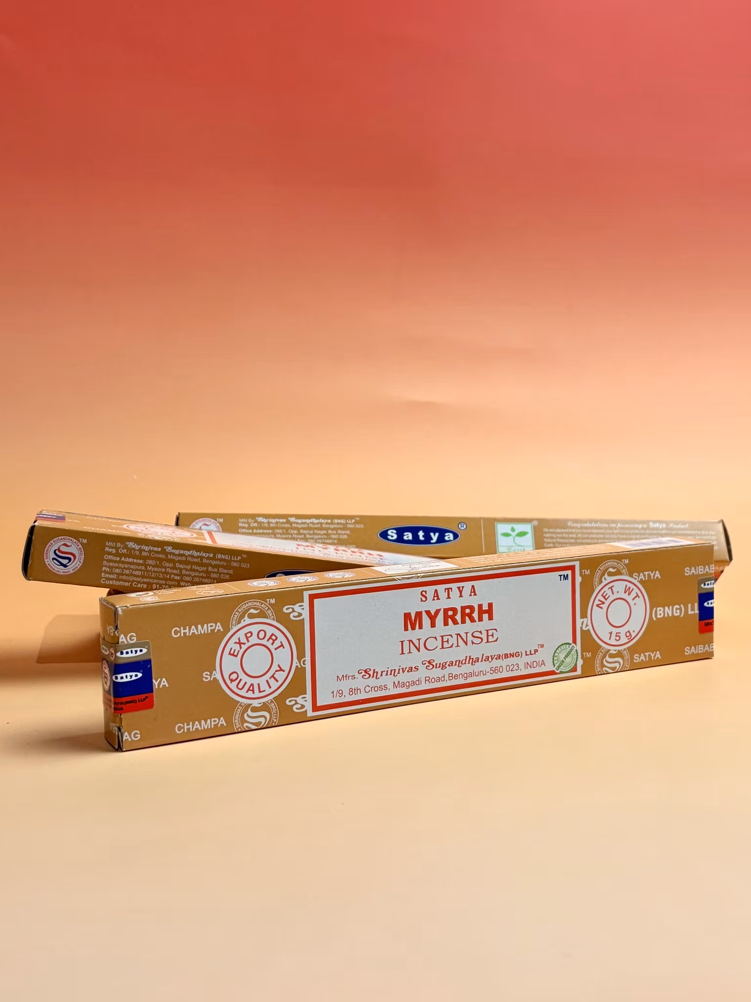 Om Myrrh: Satya Myrrh-rökelsen har en djup, varm doft med inslag av kryddiga och träiga toner. Myrra har använts i tusentals år för sina renande och spirituella egenskaper och är perfekt för meditation, bön och energirening. Dess rika och mystiska arom skapar en lugnande atmosfär som främjar inre balans och andlig fördjupning.