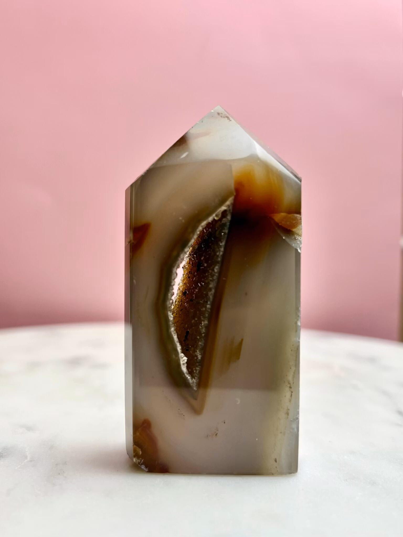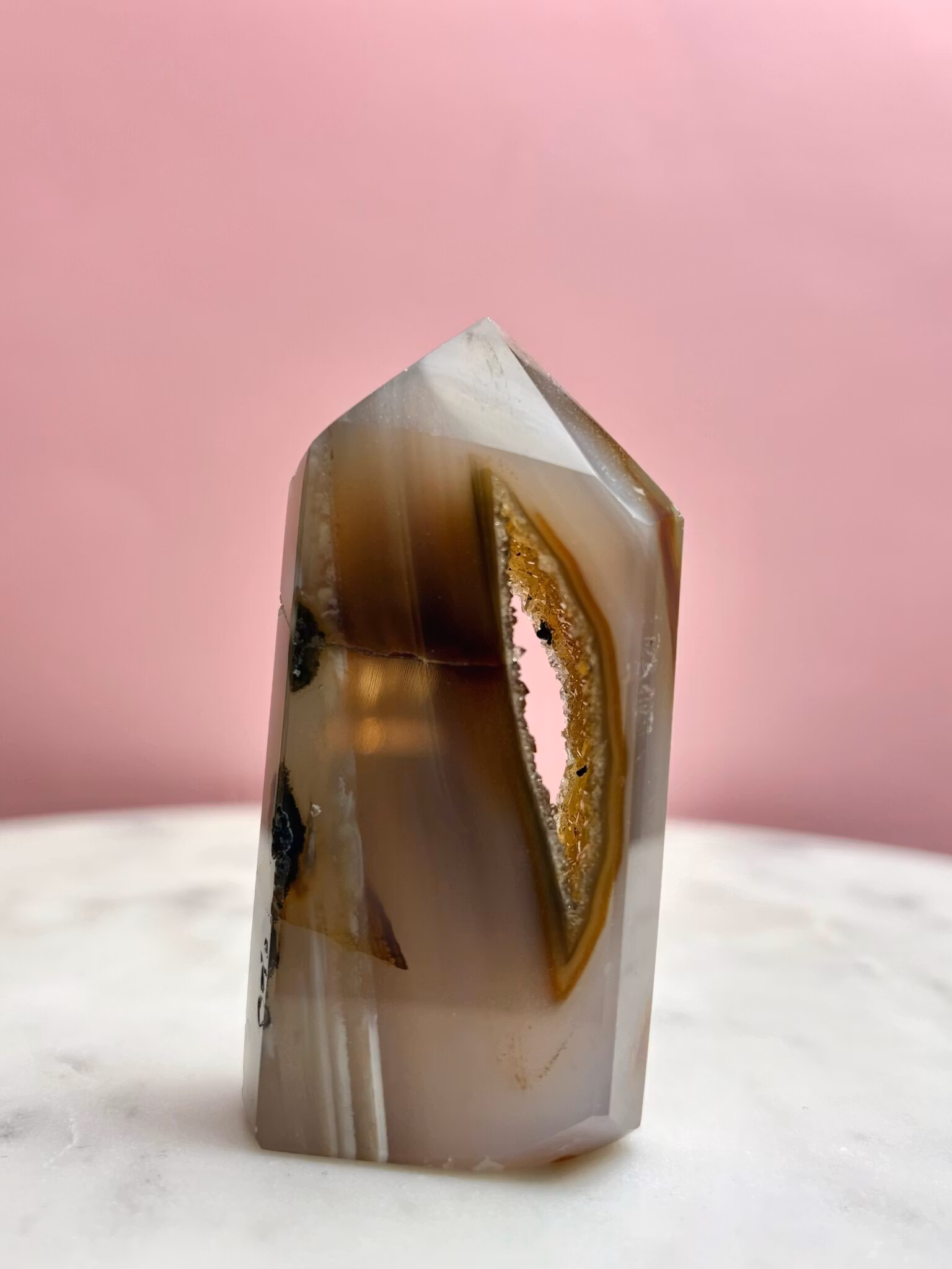 Agat är känd som en jordande sten som hjälper dig att finna lugn i en hektisk värld. Dess milda men kraftfulla energi verkar långsamt och stabiliserar känslor, vilket gör den perfekt för dig som söker inre frid och mental klarhet. Bär den som en kraftkälla. Placera den i ditt hem. Låt agat guida dig till ett liv i harmoni.