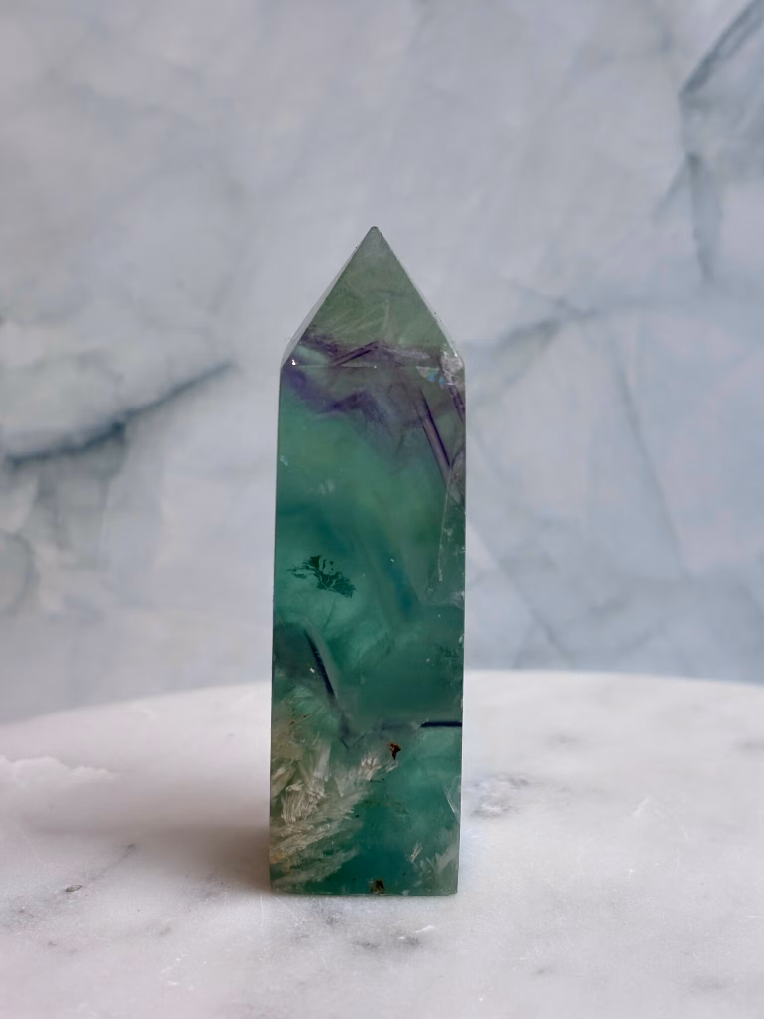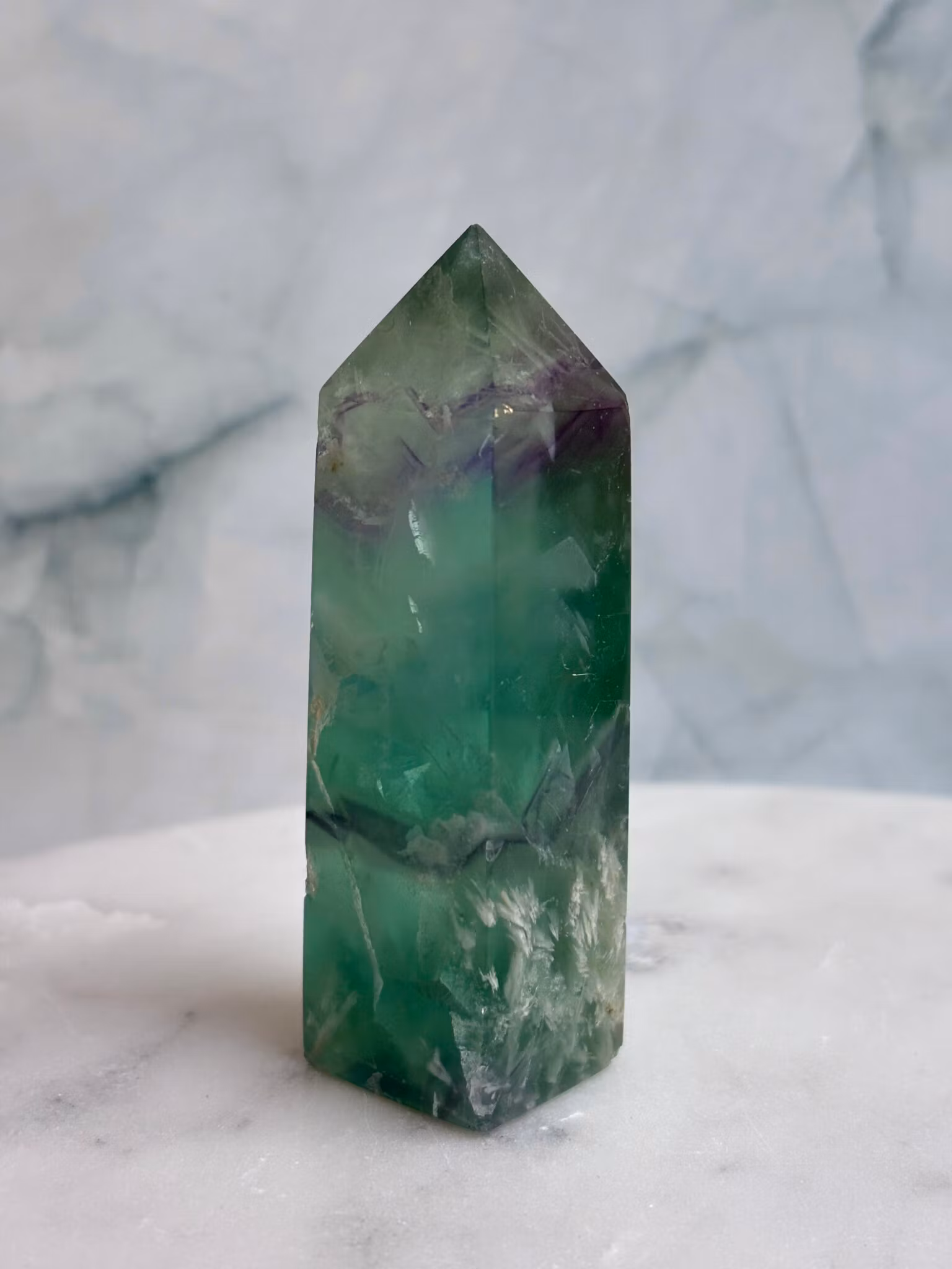 Fluorit är en kraftfull kristall som är känd för sina klara och livfulla färger, som en färgsprakande vägvisare. Fluorits klara och levande nyanser påminner om naturens magi och kan vara allt från djup lila, smaragdgrön, himmelsblå och solgul till helt genomskinlig. Fluoriten sägs hjälpa dig att skärpa ditt fokus och sortera dina tankar när livet känns överväldigande.