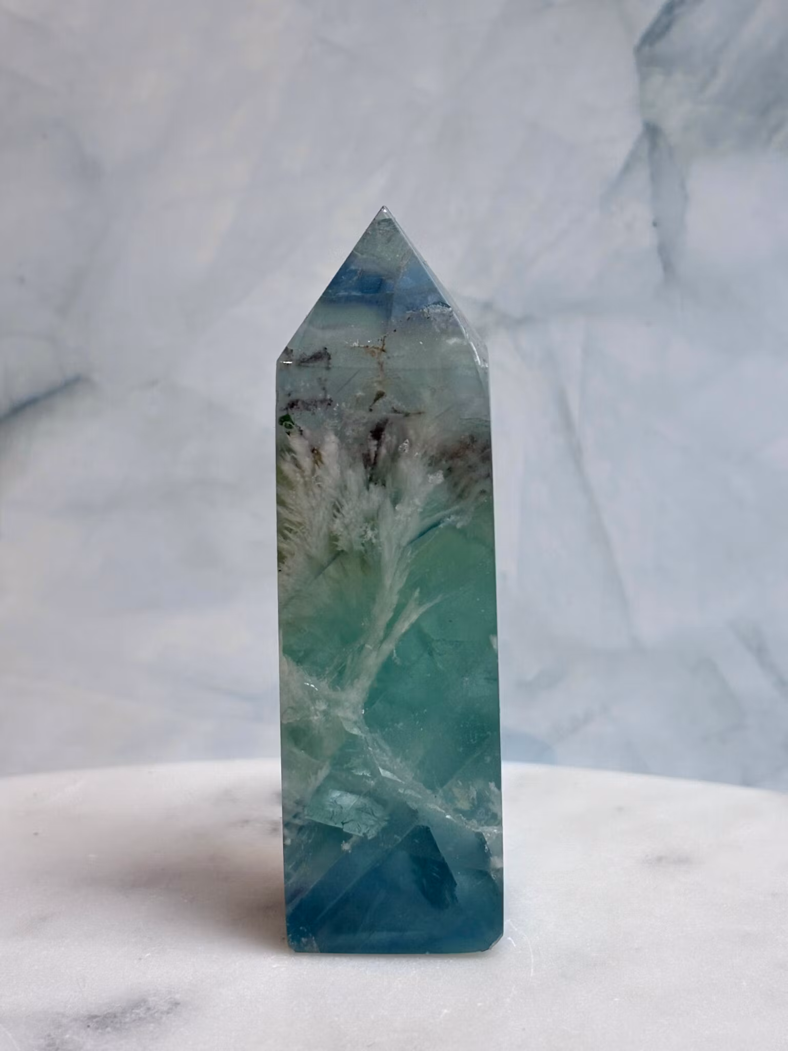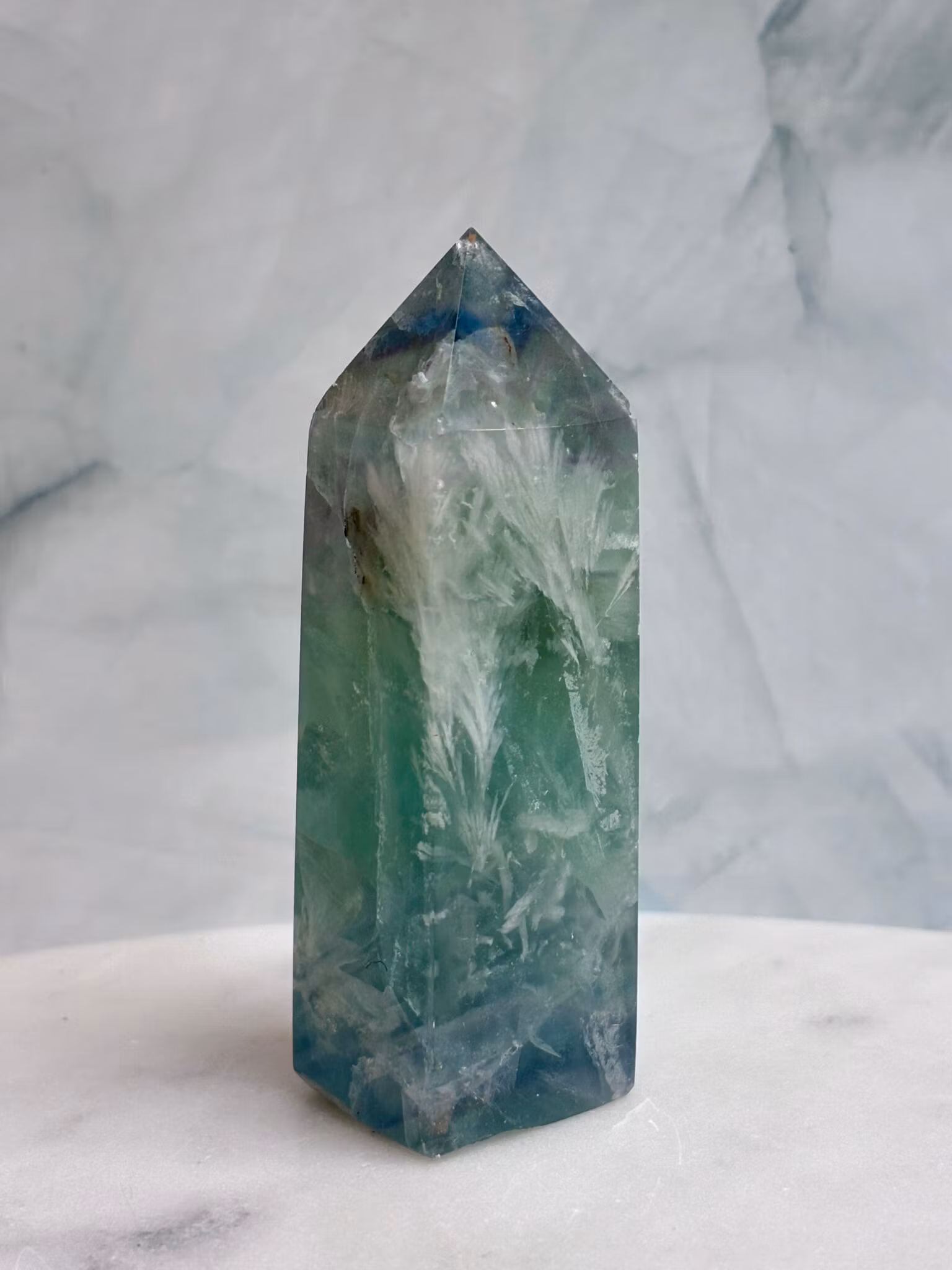 Fluorit är en kraftfull kristall som är känd för sina klara och livfulla färger, som en färgsprakande vägvisare. Fluorits klara och levande nyanser påminner om naturens magi och kan vara allt från djup lila, smaragdgrön, himmelsblå och solgul till helt genomskinlig. Fluoriten sägs hjälpa dig att skärpa ditt fokus och sortera dina tankar när livet känns överväldigande.