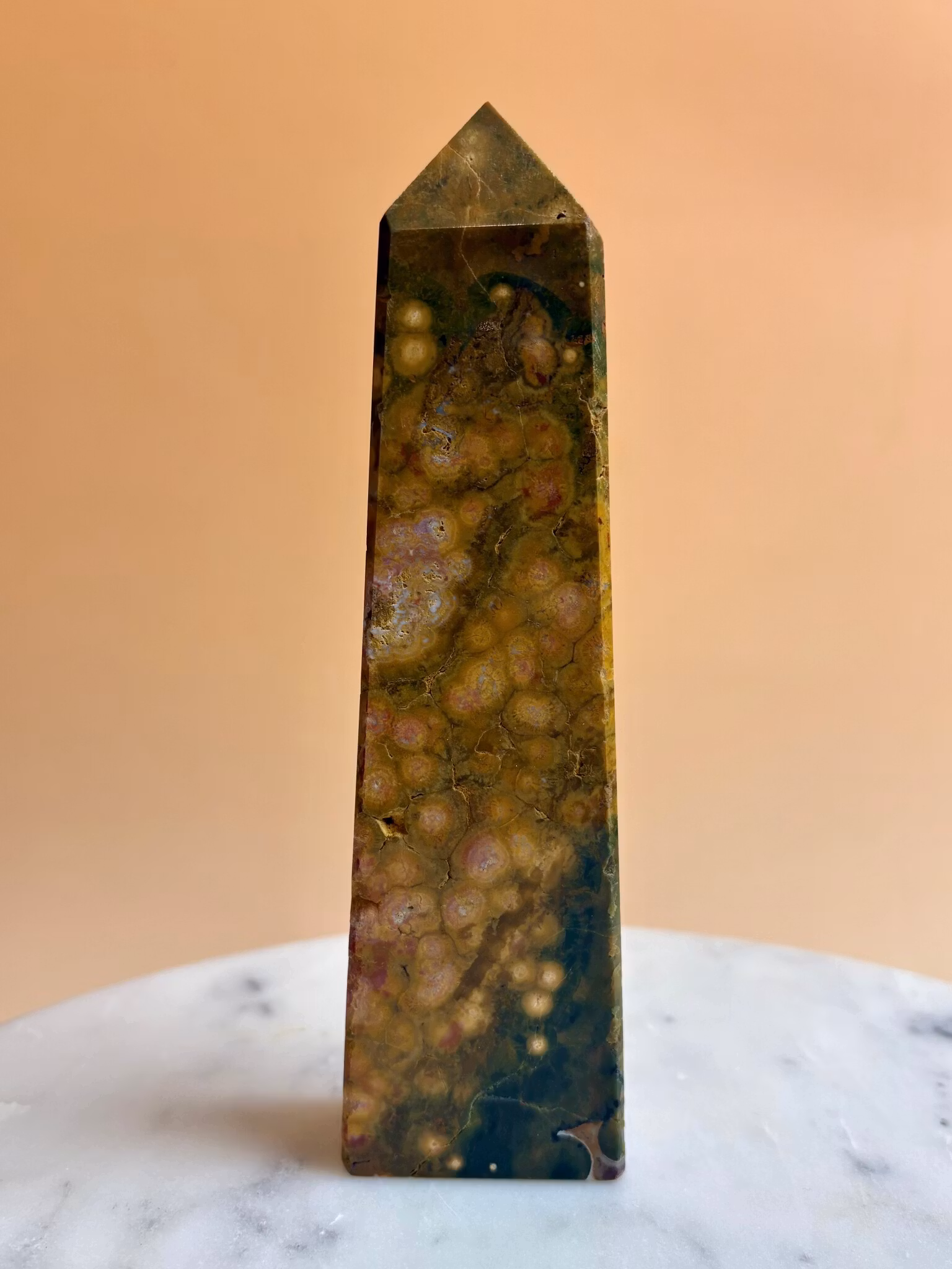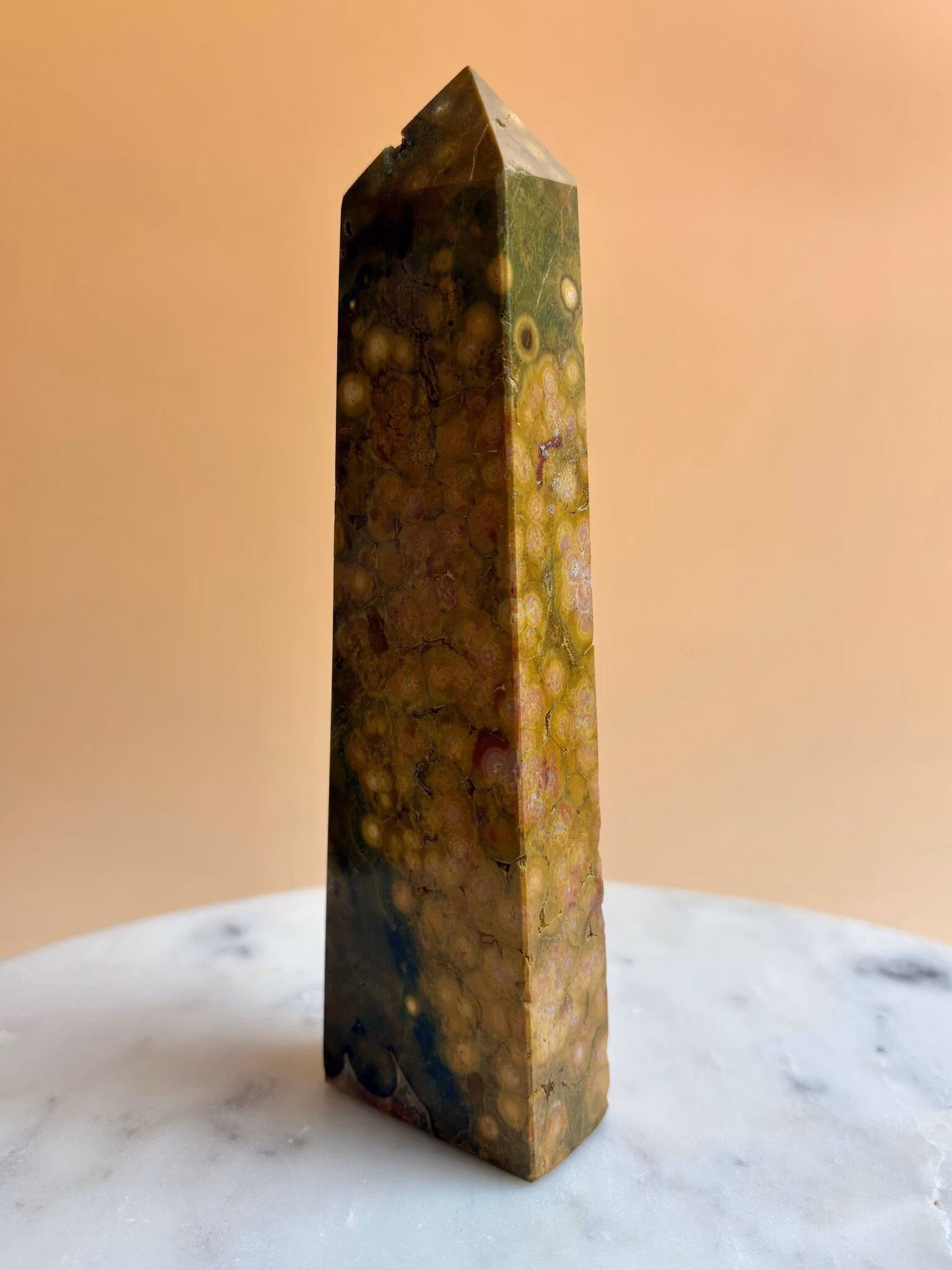 Ocean jaspis är känd som glädjens sten. Den påminner oss om att njuta av livets små ögonblick och att alltid söka efter ljuset även under svåra tider. Den kan hjälpa dig att se livet från ett ljusare perspektiv. Denna kristall har en stabiliserande energi som skapar en känsla av trygghet och förankring, särskilt under perioder av förändring
