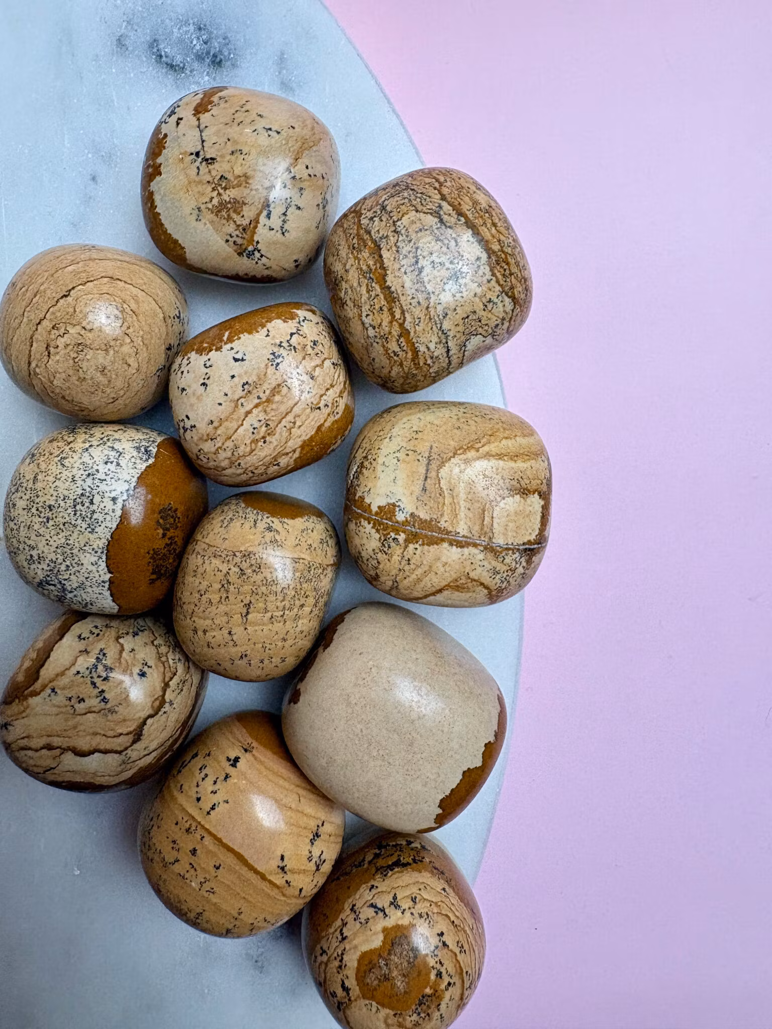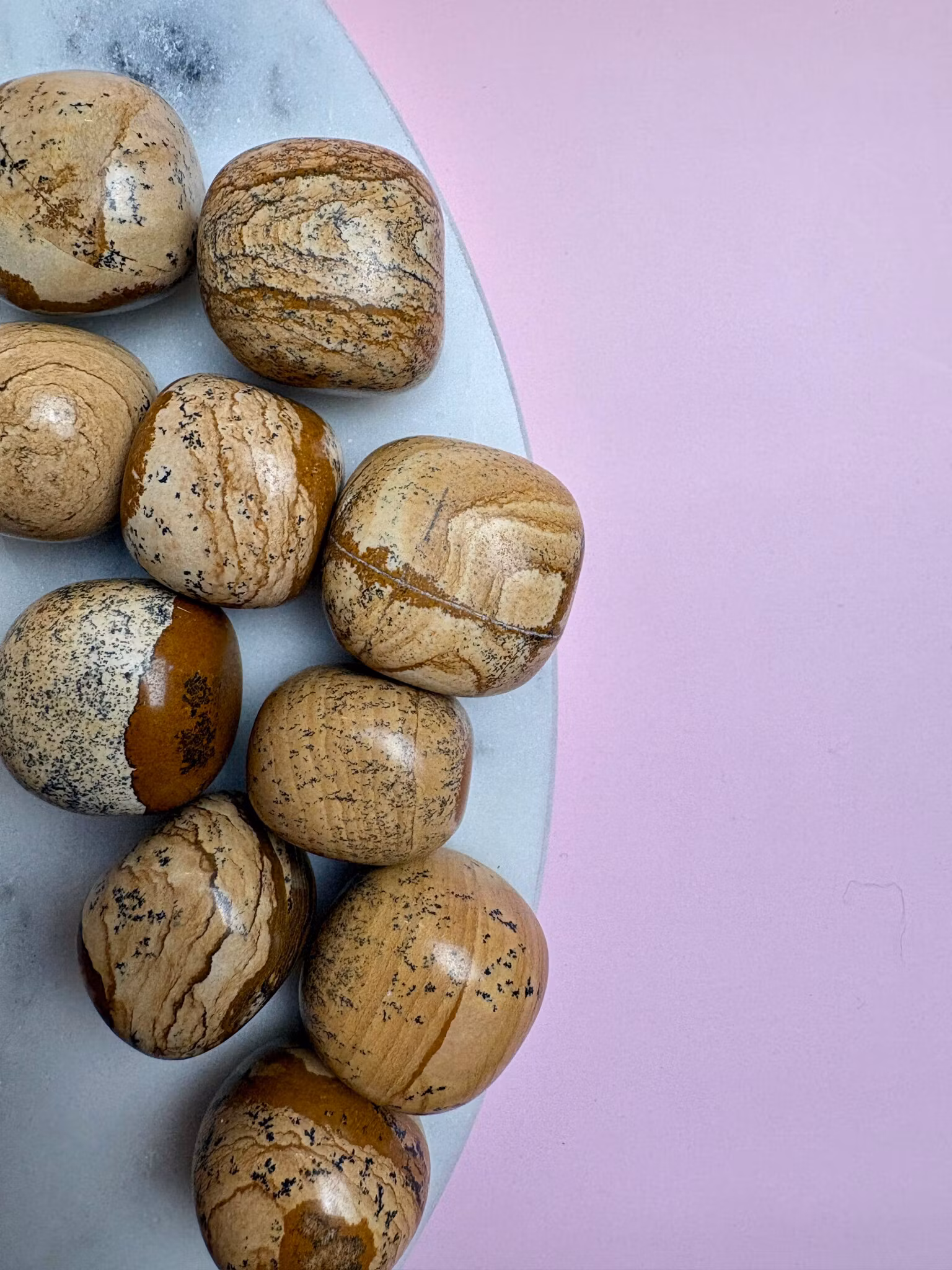 "Picture Stone Jaspis som på svenska även kallas för landskapsjapis, är en kristall som har fått sitt namn efter sitt utseende. Varje sten symboliserar ett litet landskap. Kristallen hjälper dig att hålla dig lugn, hitta din plats i livet där du vill vara och där du trivs. Det är en jordande sten och skyddar dig mot negativitet."