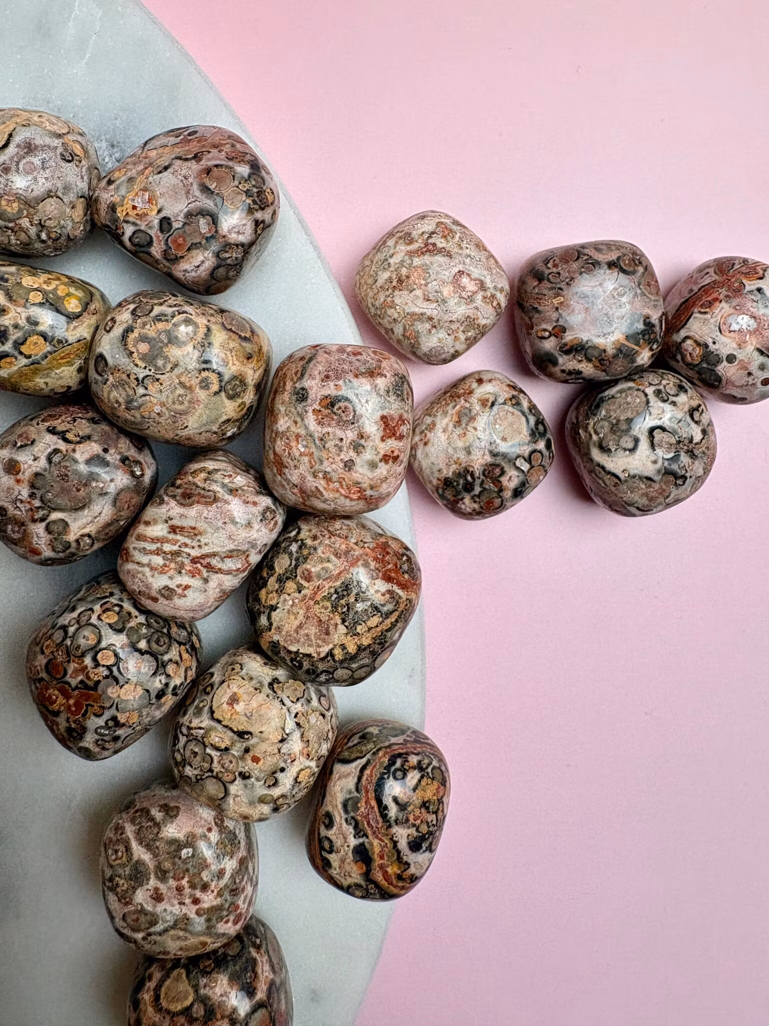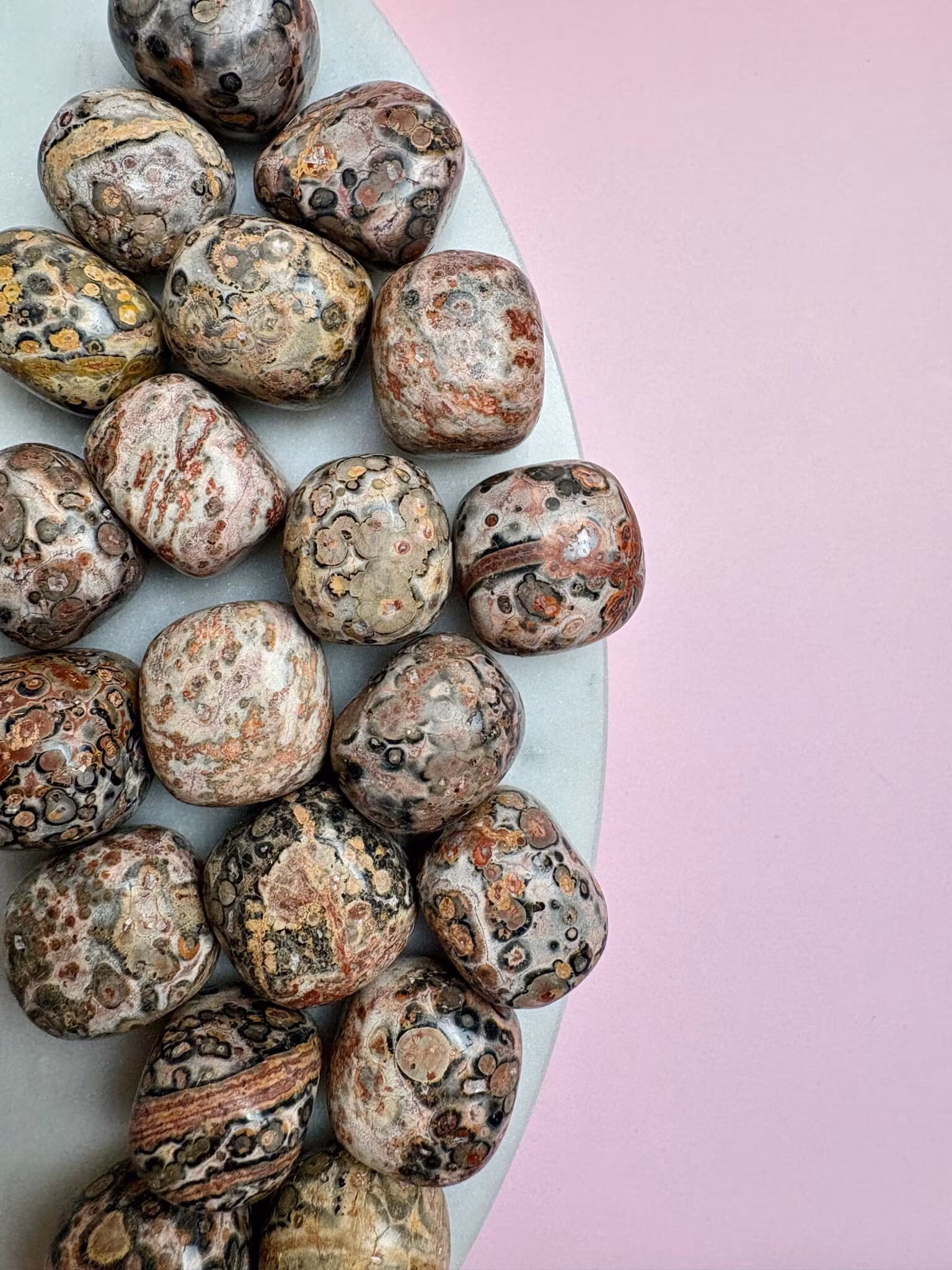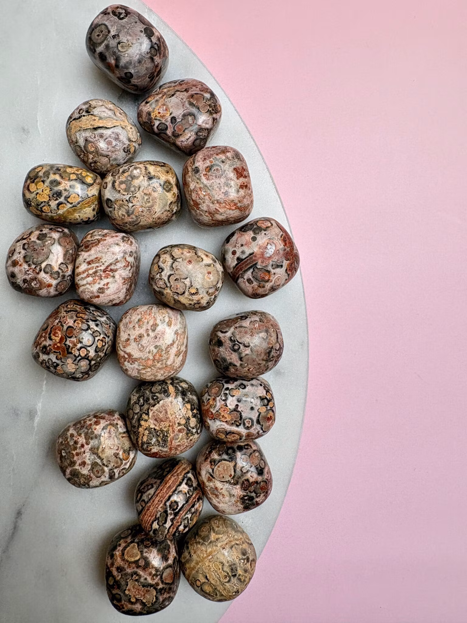 Leopardjaspis är en fascinerande kristall som kännetecknas av sitt fläckiga mönster, inspirerat av leopardens päls. Med sina varma nyanser av brunt, beige, grått, orange och ibland subtila rosa toner, utstrålar stenen en jordnära och stabiliserande energi. Denna kristall är känd för att förstärka kopplingen till naturen, vilket gör den till en idealisk följeslagare för dig som söker inre styrka och känslomässig balans.