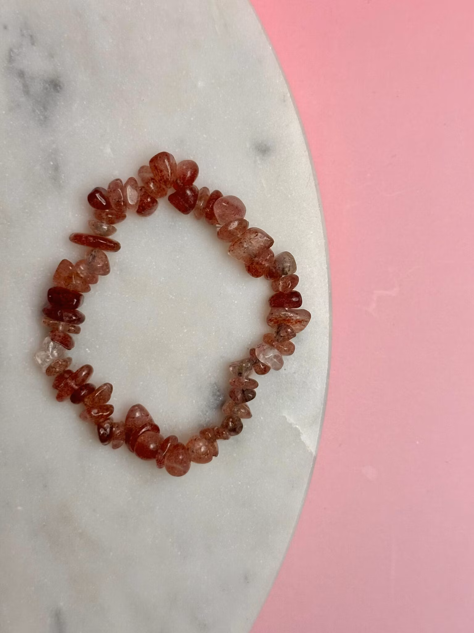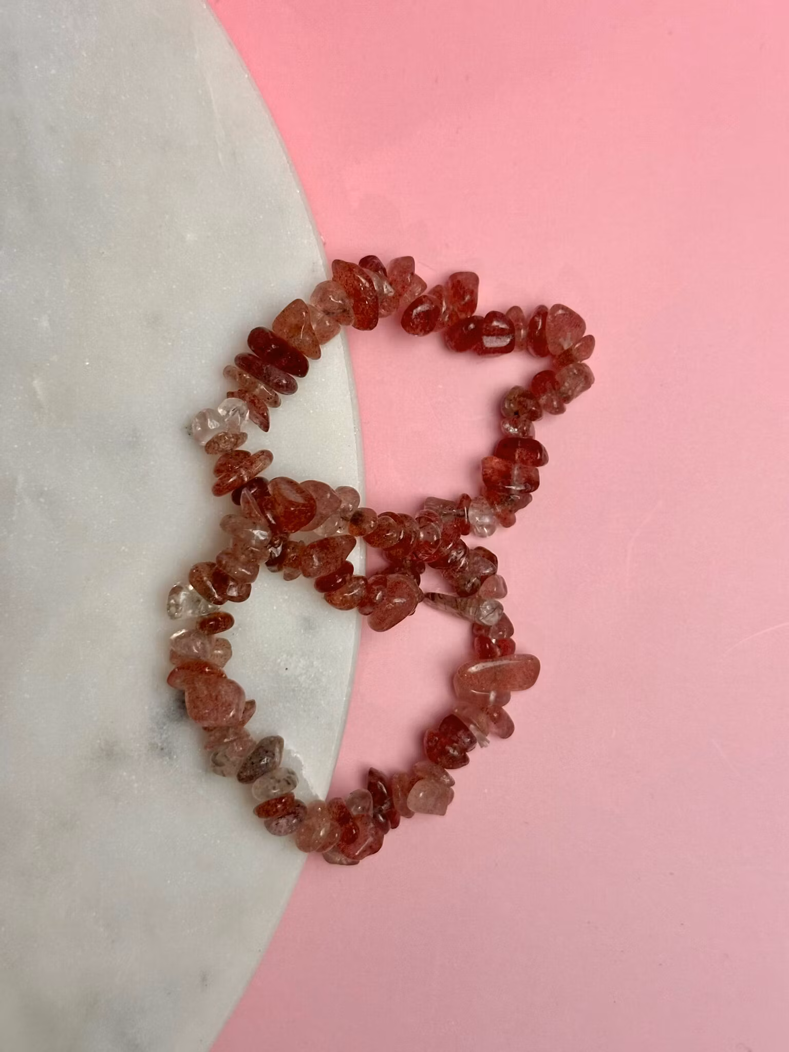 Jordgubbskvarts är en rosa kvarts full av kärlek och ljus, med sin unika nyans och glittrande prickar som påminner om en solnedgång eller sommarens första jordgubbar. Den är känd för att hjälpa till att locka till sig sin ‘’soulmate’’ genom att öppna hjärtat och främja kommunikation. Dess energi sägs ge en känsla av lugn, balans och tacksamhet och påminner dig om att verkligen ta vara på livet. Jordgubbskvarts uppmuntrar dig att släppa gamla sår, vara närvarande i nuet och omfamna kärleken – både inom dig själv och i dina relationer.