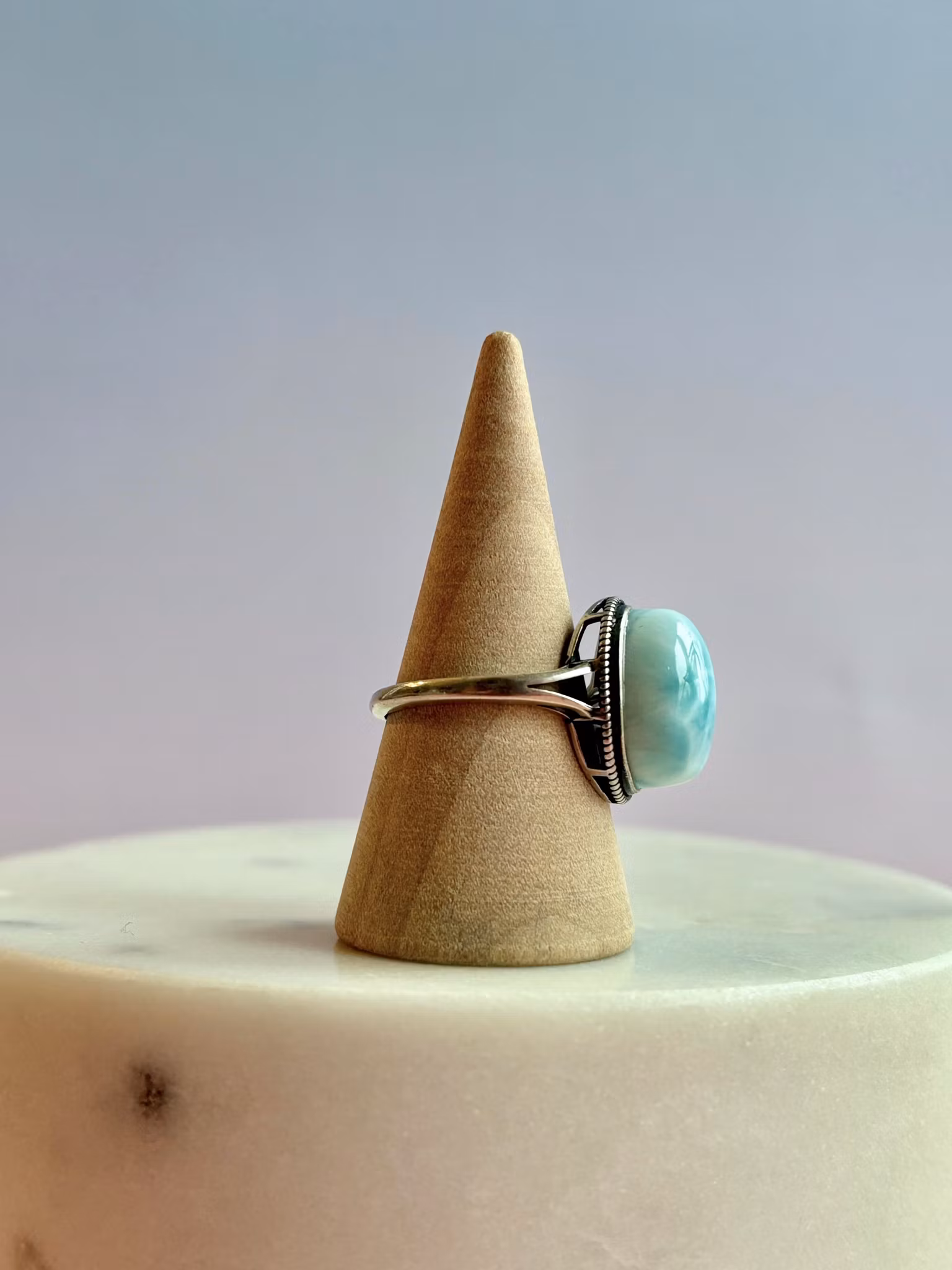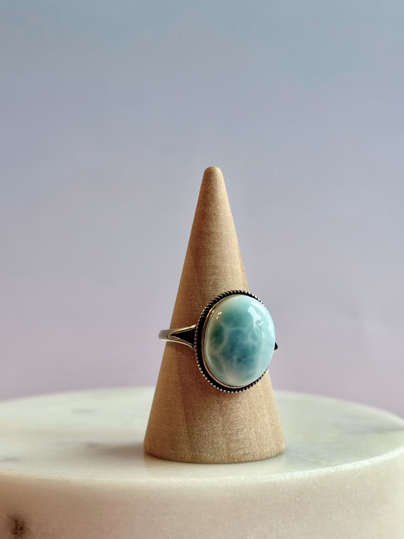 Vår populära egendesignade magiska ring med en sten i kristallen Larimar! Ringen har vår logga på sidan.