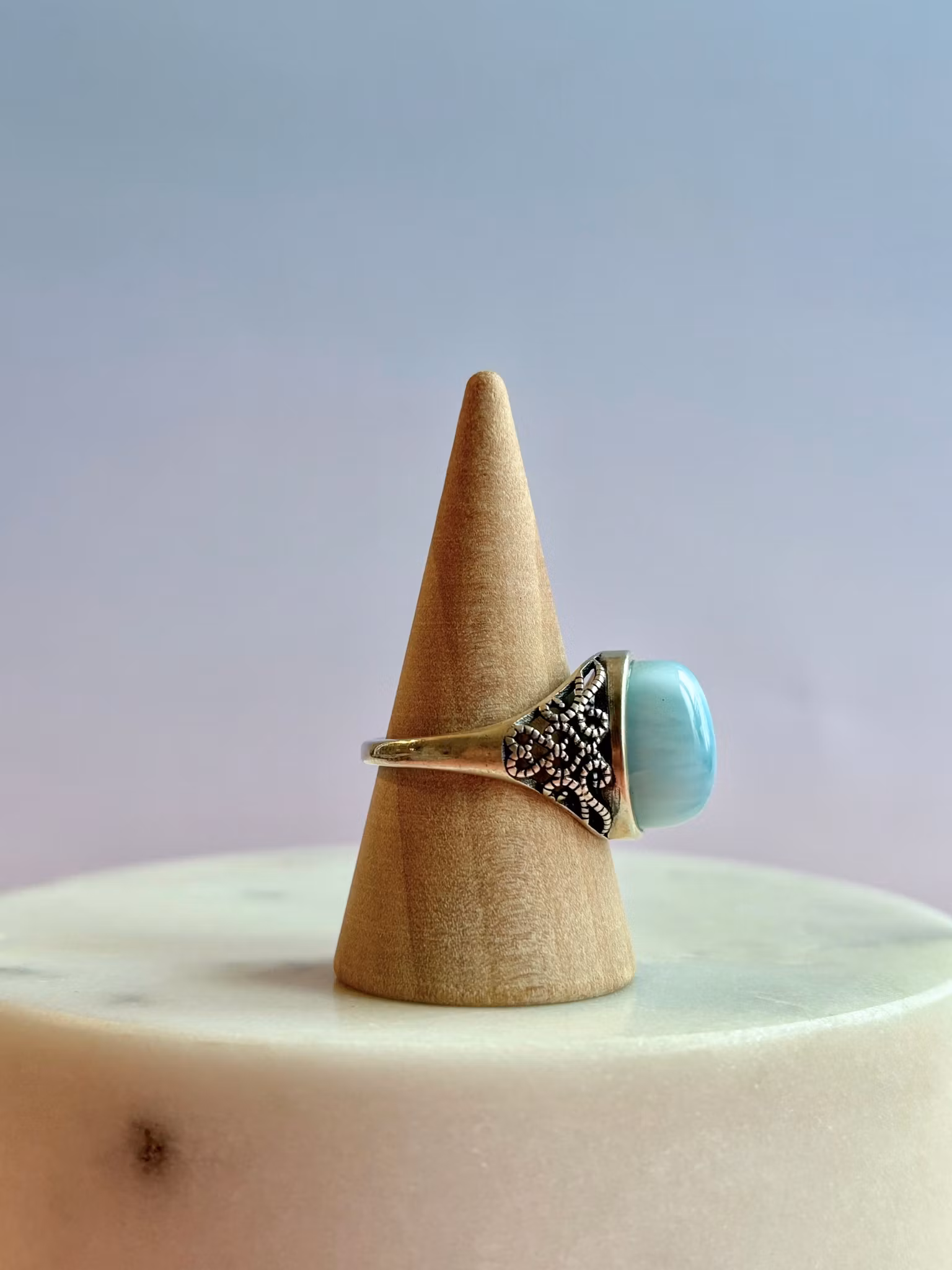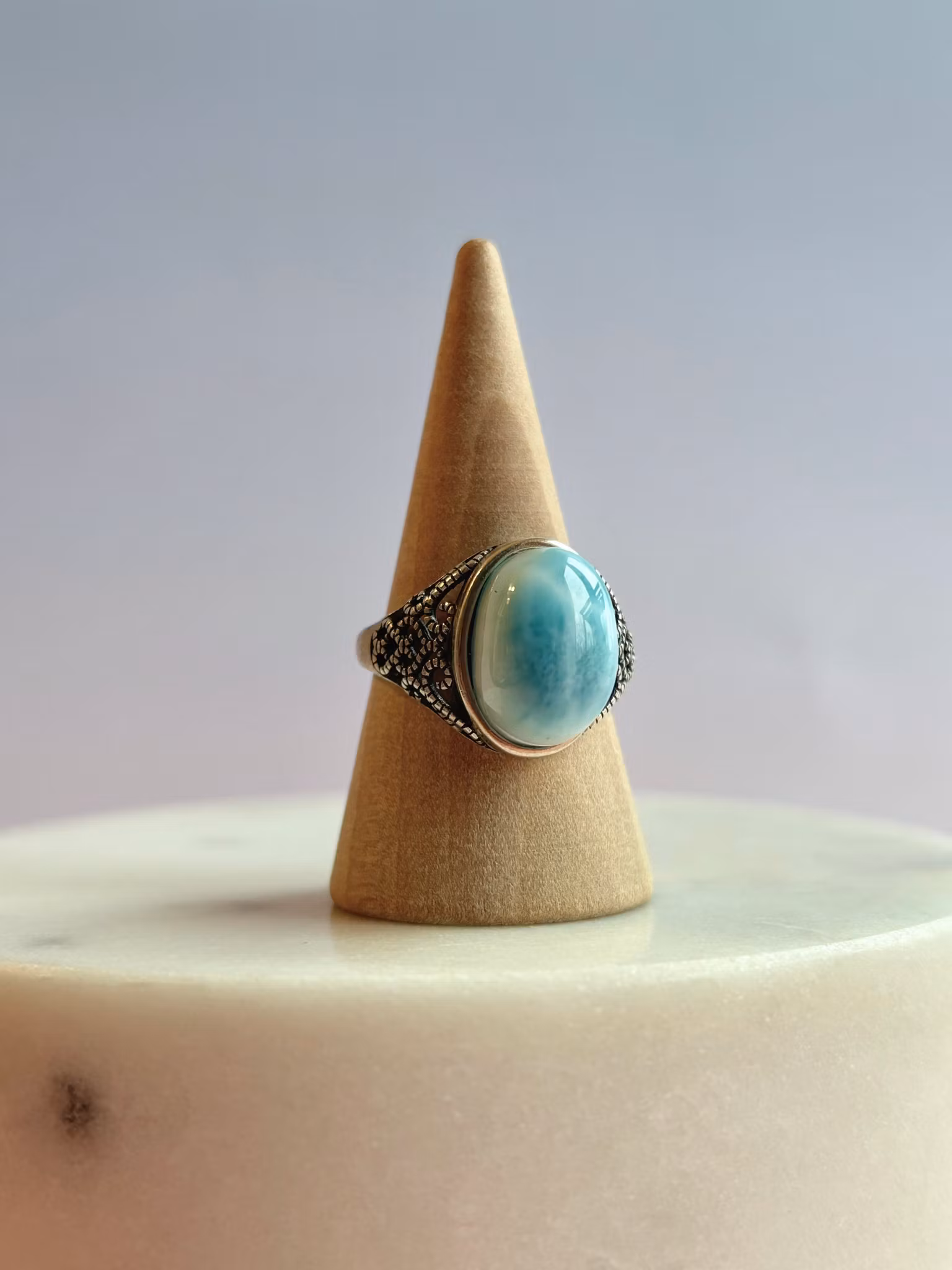Vår populära egendesignade magiska ring med en sten i kristallen Larimar! Ringen har vår logga på sidan.